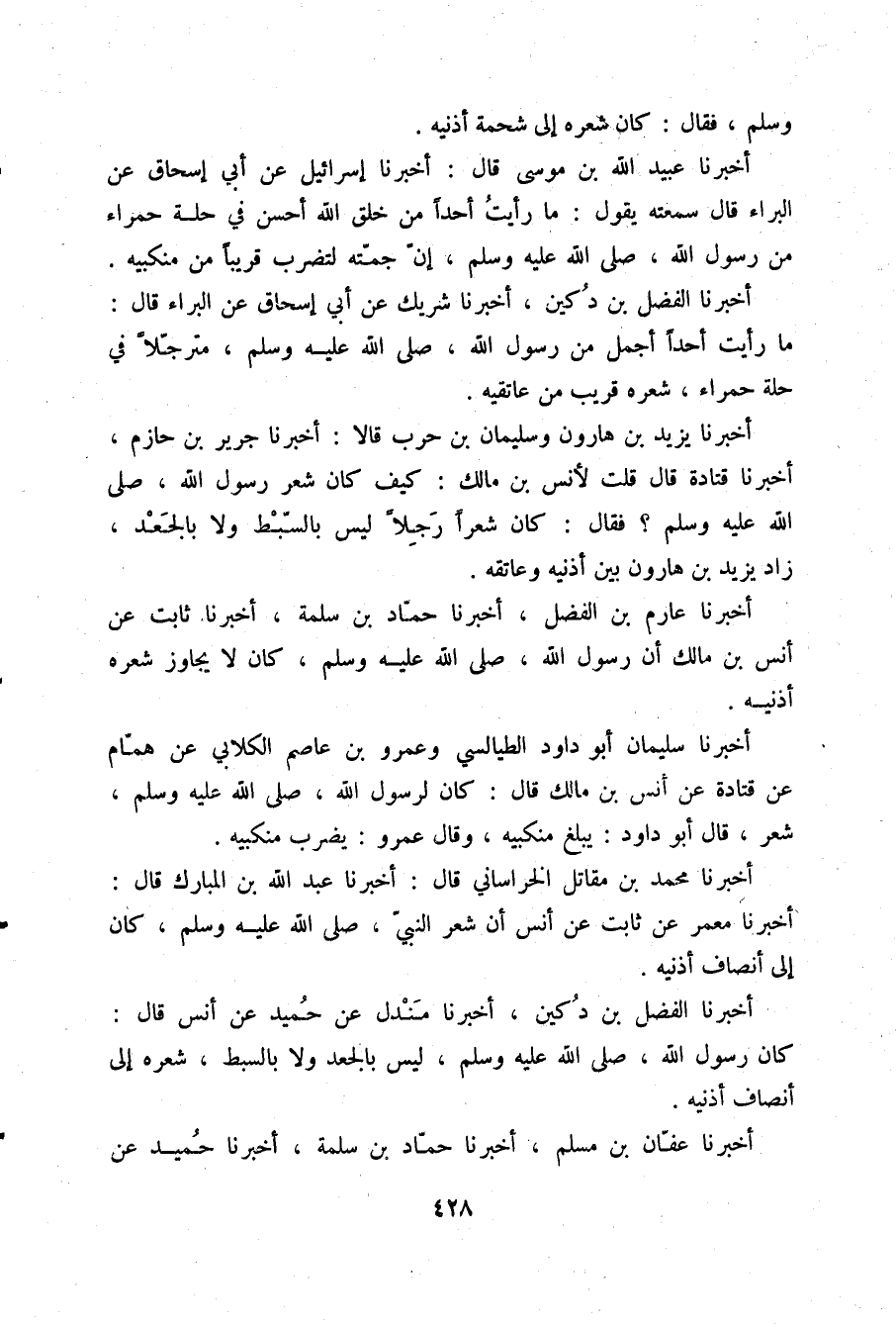أَخْبَرَنَا الْفَضْلُ بْنُ دُكَيْنٍ، أَخْبَرَنَا شَرِيكٌ، عَنْ أَبِي إِسْحَاقَ، عَنِ الْبَرَاءِ قَالَ: §مَا رَأَيْتُ أَحَدًا أَجْمَلَ مِنْ رَسُولِ اللَّهِ صلّى الله عليه وسلم مُتَرَجِّلًا فِي حُلَّةٍ حَمْرَاءَ شَعْرُهُ قَرِيبٌ مِنْ عَاتِقَيْهِ