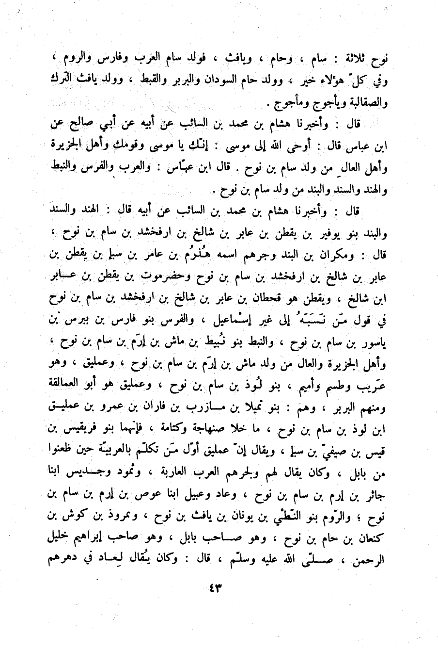 قَالَ: وَأَخْبَرَنَا هِشَامُ بْنُ مُحَمَّدِ بْنِ السَّائِبِ، عَنْ أَبِيهِ قَالَ: §الْهِنْدُ، وَالسِّنْدُ، وَالْبَنْدُ بَنُو يُوفِيرَ بْنِ يَقْطُنَ بْنِ عَابِرِ بْنِ شَالِخِ بْنِ أَرْفَخَشْدِ بْنِ سَامِ بْنِ نُوحٍ قَالَ: وَمُكْرَانُ بْنُ الْبَنْدِ وَجُرْهُمُ اسْمُهُ هُذْرُمُ بْنُ عَامِرِ بْنِ سَبَأِ بْنِ يَقْطُنَ بْنِ عَابِرِ بْنِ شَالِخِ بْنِ أَرْفَخَشْدِ بْنِ سَامِ بْنِ نُوحٍ وَحَضْرَمُوتُ بْنُ يَقْطُنَ بْنِ عَابِرِ بْنِ شَالِخٍ وَيَقْطَنُ هُوَ قَحْطَانُ بْنُ عَابِرِ بْنِ شَالِخِ بْنِ أَرْفَخَشْدِ بْنِ سَامِ بْنِ نُوحٍ فِي قَوْلِ مَنْ نَسَبَهُ إِلَى غَيْرِ إِسْمَاعِيلَ. وَالْفُرْسُ بَنُو فَارِسَ بْنِ بَبْرَسَ بْنِ يَاسُورَ بْنِ سَامِ بْنِ نُوحٍ، وَالنَّبَطُ بَنُو نُبَيْطِ بْنِ مَاشِ بْنِ إِرَمَ بْنِ سَامِ بْنِ نُوحٍ، وَأَهْلُ الْجَزِيرَةِ وَالْعَالُ مِنْ وَلَدِ مَاشِ بْنِ إِرَمَ بْنِ سَامِ بْنِ نُوحٍ، وَعِمْلِيقُ وَهُوَ عَرِيبُ وَطِسْمُ وَأَمِيمُ بَنُو لَوْذِ بْنِ سَامِ بْنِ نُوحٍ وَعِمْلِيقُ هُوَ أَبُو الْعَمَالِقَةِ وَمِنْهُمُ الْبَرْبَرُ وَهُمْ بَنُو تميلَا بْنِ مَازِرِبِ بْنِ فَارَانَ بْنِ عَمْرِو بْنِ عِمْلِيقِ بْنِ لَوْذِ بْنِ سَامِ بْنِ نُوحٍ مَا خَلَا صِنْهَاجَةَ وَكَتَّامَةَ فَإِنَّهُمَا بَنُو فريقيس بْنِ قَيْسِ بْنِ صَيْفِيِّ بْنِ سَبَأٍ وَيُقَالُ إِنَّ عِمْلِيقَ أَوَّلُ مَنْ تَكَلَّمَ بِالْعَرَبِيَّةِ حِينَ ظَعَنُوا مِنْ بَابِلَ وَكَانَ يُقَالُ لَهُمْ وَلِجُرْهُمَ الْعَرَبُ الْعَارِبَةُ وَثَمُودُ وَجُدَيْسُ ابْنَا جَاثِرِ بْنِ إِرَمَ بْنِ سَامِ بْنِ نُوحٍ وَعَادٌ وَعُبَيْلُ ابْنَا عَوْصِ بْنِ إِرَمَ بْنِ سَامِ بْنِ نُوحٍ وَالرُّومُ بَنُو النَّطِّيِّ بْنِ يُونَانَ بْنِ يَافِثَ بْنِ نُوحٍ وَنَمْرُوذُ بْنُ كُوشَ بْنِ كَنْعَانَ بْنِ حَامِ بْنِ نُوحٍ وَهُوَ صَاحِبُ بَابِلَ وَهُوَ صَاحِبُ إِبْرَاهِيمَ خَلِيلِ الرَّحْمَنِ صلّى الله عليه وسلم، قَالَ: وَكَانَ يُقَالُ لِعَادٍ فِي دَهْرِهِمْ