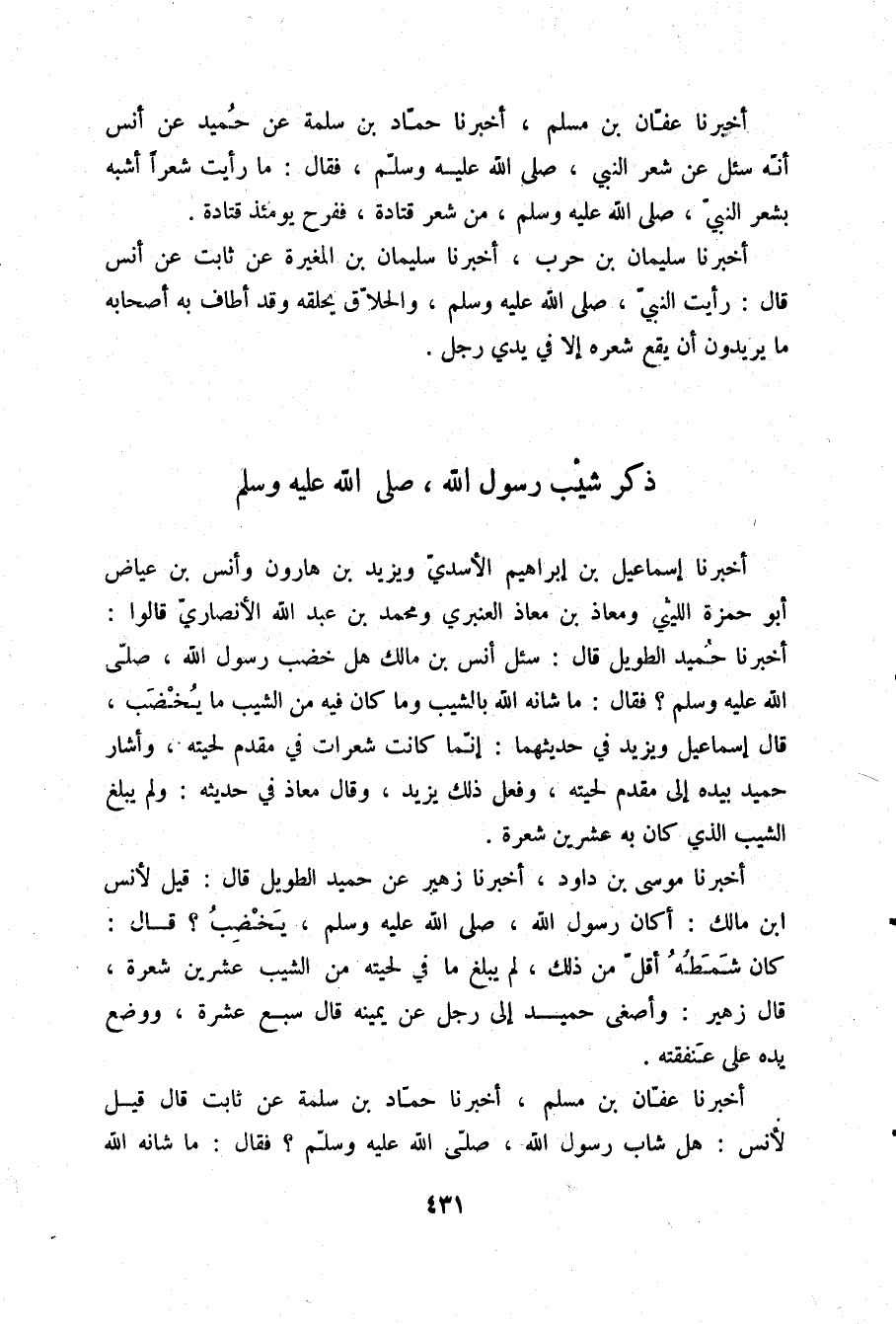 أَخْبَرَنَا إِسْمَاعِيلُ بْنُ إِبْرَاهِيمَ الْأَسَدِيُّ، وَيَزِيدُ بْنُ هَارُونَ، وَأَنَسُ بْنُ عِيَاضٍ أَبُو حَمْزَةَ اللَّيْثِيُّ، وَمُعَاذٌ الْعَنْبَرِيُّ، وَمُحَمَّدُ بْنُ عَبْدِ اللَّهِ الْأَنْصَارِيُّ، قَالُوا: أَخْبَرَنَا حُمَيْدٌ الطَّوِيلُ قَالَ: سُئِلَ أَنَسُ بْنُ مَالِكٍ هَلْ خَضَبَ رَسُولُ اللَّهِ صلّى الله عليه وسلم فَقَالَ: §مَا شَانَهُ اللَّهُ بِالشَّيْبِ وَمَا كَانَ فِيهِ مِنَ الشَّيْبِ مَا يُخْضَبُ قَالَ إِسْمَاعِيلُ وَيَزِيدُ فِي حَدِيثِهِمَا: إِنَّمَا كَانَتْ شَعَرَاتٌ فِي مُقَدَّمِ لِحْيَتِهِ وَأَشَارَ حُمَيْدٌ بِيَدِهِ إِلَى مُقَدَّمِ لِحْيَتِهِ وَفَعَلَ ذَلِكَ يَزِيدُ وَقَالَ مُعَاذٌ: فِي حَدِيثِهِ وَلَمْ يَبْلُغِ الشَّيْبُ الَّذِي كَانَ بِهِ عِشْرِينَ شَعْرَةً