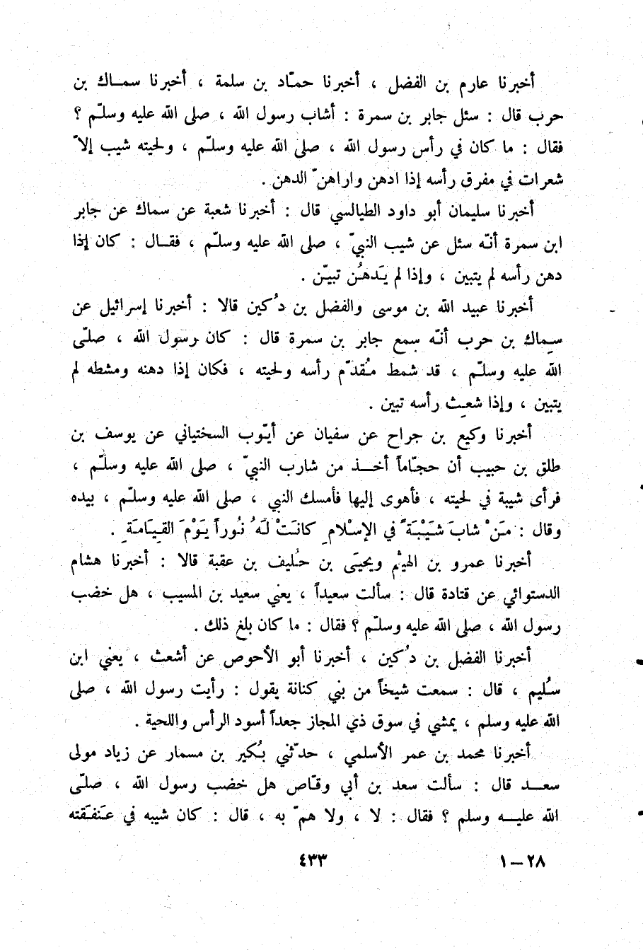أَخْبَرَنَا سُلَيْمَانُ أَبُو دَاوُدَ الطَّيَالِسِيُّ قَالَ: أَخْبَرَنَا شُعْبَةُ، عَنْ سِمَاكٍ، عَنْ جَابِرِ بْنِ سَمُرَةَ، أَنَّهُ سُئِلَ عَنْ شَيْبِ النَّبِيِّ، صلّى الله عليه وسلم فَقَالَ: كَانَ §إِذَا دَهَنَ رَأْسَهُ لَمْ يَتَبَيَّنْ وَإِذَا لَمْ يَدْهُنْ تَبَيَّنَ