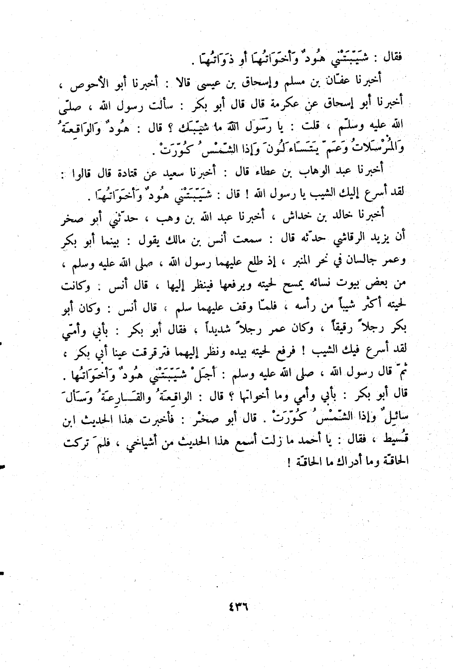 أَخْبَرَنَا عَفَّانُ بْنُ مُسْلِمٍ، وَإِسْحَاقُ بْنُ عِيسَى قَالَا: أَخْبَرَنَا أَبُو الْأَحْوَصِ، أَخْبَرَنَا أَبُو إِسْحَاقَ، عَنْ عِكْرِمَةَ قَالَ: قَالَ أَبُو بَكْرٍ: سَأَلْتُ رَسُولَ اللَّهِ صلّى الله عليه وسلم قُلْتُ: يَا رَسُولَ اللَّهِ §مَا شَيَّبَكَ؟ قَالَ: «هُودٌ وَالْوَاقِعَةُ وَالْمُرْسَلَاتُ وَعَمَّ يَتَسَاءَلُونَ وَإِذَا الشَّمْسُ كُوِّرَتْ»