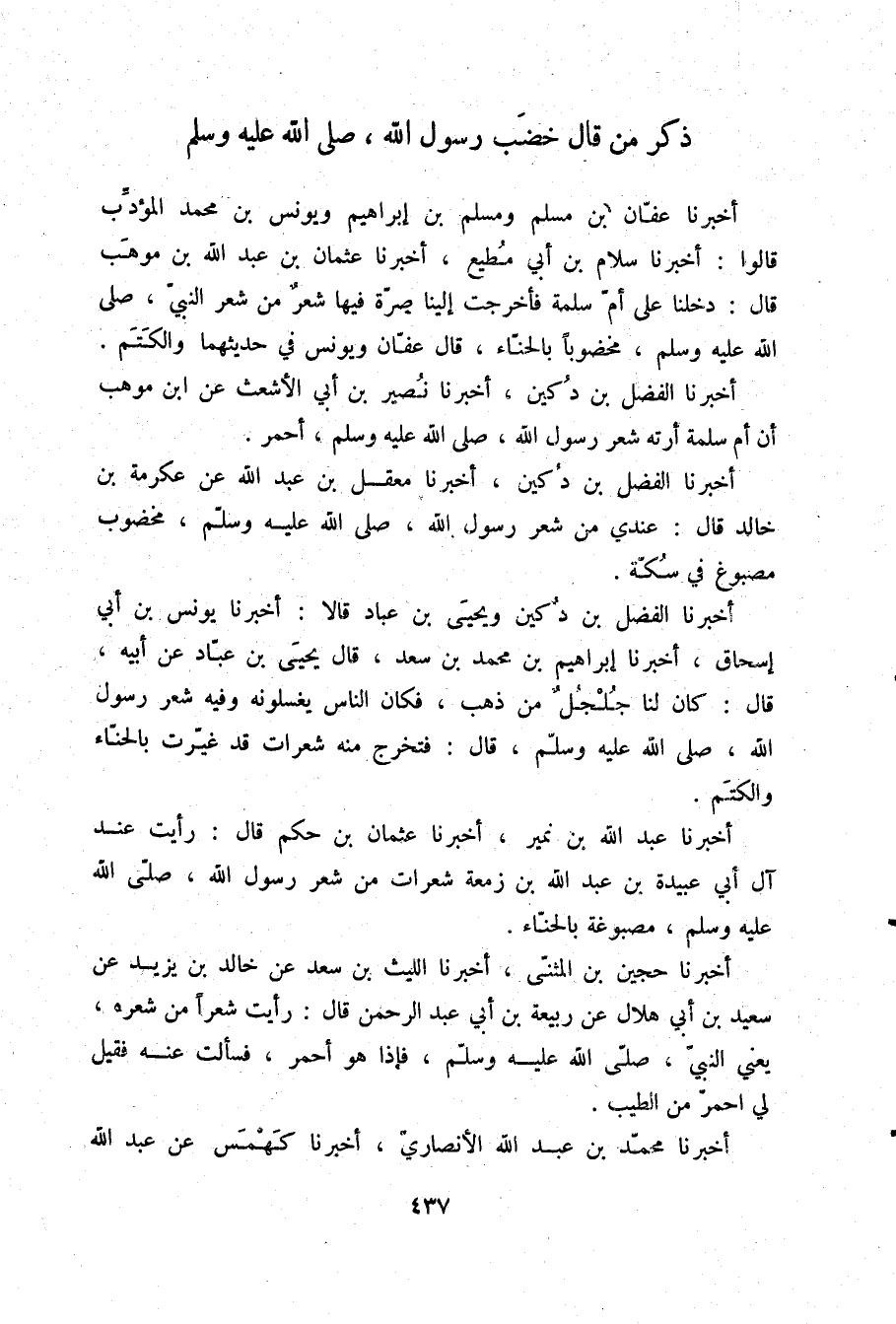 أَخْبَرَنَا عَفَّانُ بْنُ مُسْلِمٍ، وَمُسْلِمُ بْنُ إِبْرَاهِيمَ، وَيُونُسُ بْنُ مُحَمَّدٍ الْمُؤَدِّبُ، قَالُوا: أَخْبَرَنَا سَلَّامُ بْنُ أَبِي مُطِيعٍ، أَخْبَرَنَا عُثْمَانُ بْنُ عَبْدِ اللَّهِ بْنِ مَوْهَبٍ قَالَ: دَخَلْنَا عَلَى أُمِّ سَلَمَةَ §فَأَخْرَجَتْ إِلَيْنَا صُرَّةً فِيهَا شَعْرٌ مِنْ شَعْرِ النَّبِيِّ صلّى الله عليه وسلم مَخْضُوبًا بِالْحِنَّاءِ قَالَ عَفَّانُ وَيُونُسُ فِي حَدِيثِهِمَا: وَالْكَتَمِ
