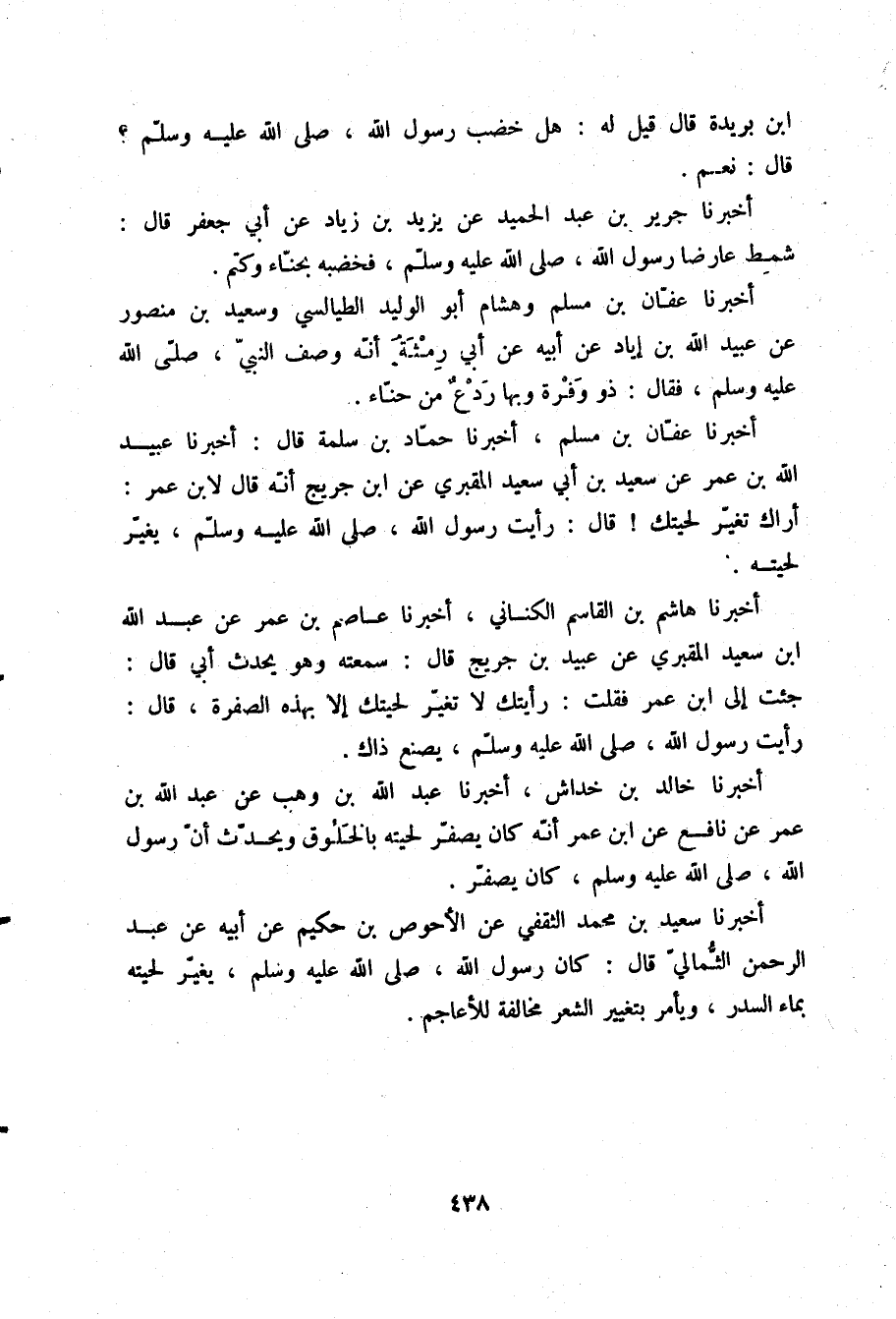 أَخْبَرَنَا عَفَّانُ بْنُ مُسْلِمٍ، أَخْبَرَنَا حَمَّادُ بْنُ سَلَمَةَ قَالَ: أَخْبَرَنَا عُبَيْدُ اللَّهِ بْنُ عُمَرَ، عَنْ سَعِيدِ بْنِ أَبِي سَعِيدٍ الْمَقْبُرِيِّ، عَنِ ابْنِ جُرَيْجٍ، أَنَّهُ قَالَ لِابْنِ عُمَرَ: أَرَاكَ تُغَيِّرُ لِحْيَتَكَ؟ قَالَ: §رَأَيْتُ رَسُولَ اللَّهِ صلّى الله عليه وسلم يُغَيِّرُ لِحْيَتَهُ