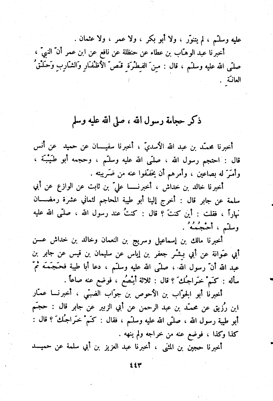 أَخْبَرَنَا أَبُو الْجَوَّابِ بْنُ الْأَحْوَصِ بْنِ جَوَّابٍ الضَّبِّيُّ، أَخْبَرَنَا عَمَّارُ بْنُ رُزَيْقٍ، عَنْ مُحَمَّدِ بْنِ عَبْدِ الرَّحْمَنِ، عَنْ أَبِي الزُّبَيْرِ، عَنْ جَابِرٍ قَالَ: §حَجَمَ أَبُو طَيْبَةَ رَسُولَ اللَّهِ صلّى الله عليه وسلم فَقَالَ: «كَمْ خَرَاجُكَ؟» قَالَ: كَذَا وَكَذَا فَوَضَعَ عَنْهُ مِنْ خَرَاجِهِ وَلَمْ يَنْهَهُ