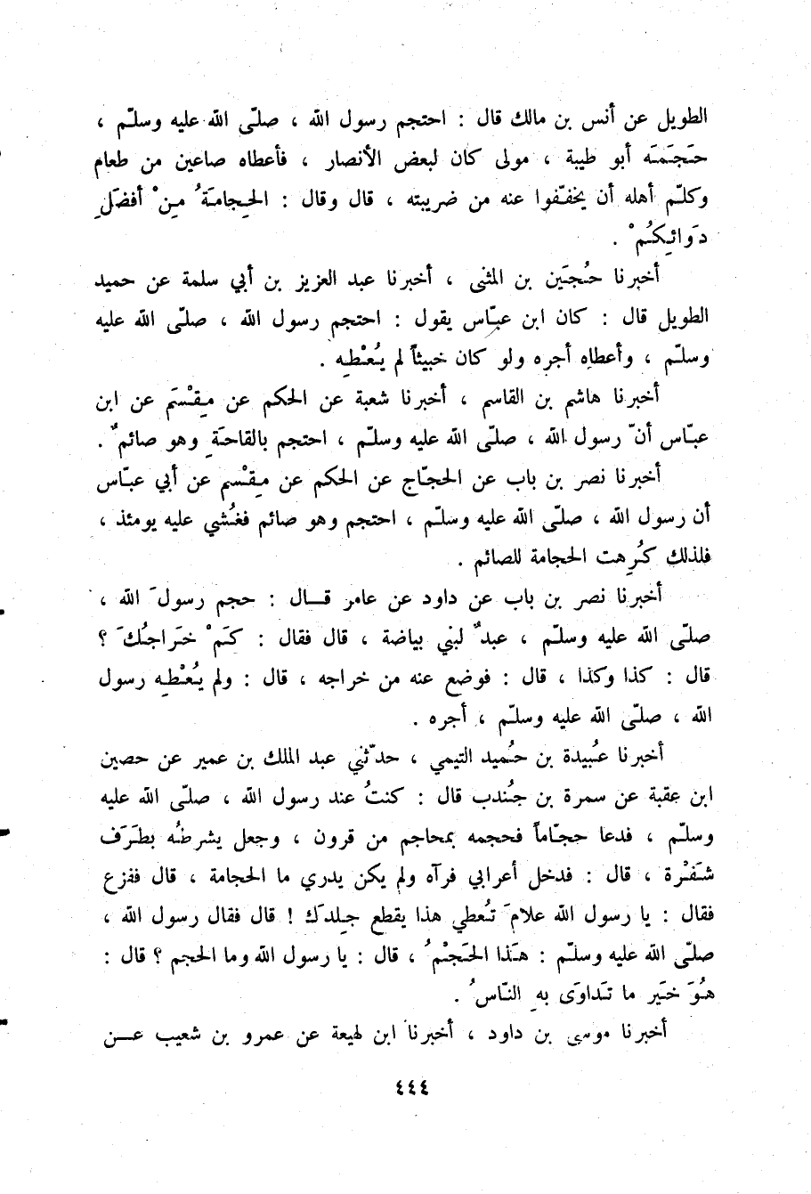أَخْبَرَنَا مُوسَى بْنُ دَاوُدَ، أَخْبَرَنَا ابْنُ لَهِيعَةَ، عَنْ عَمْرِو بْنِ شُعَيْبٍ، عَنْ -[445]- أَبِيهِ، عَنْ جَدِّهِ قَالَ: §احْتَجَمَ رَسُولُ اللَّهِ صلّى الله عليه وسلم فَأَعْطَى الْحَجَّامَ أَجْرَهُ