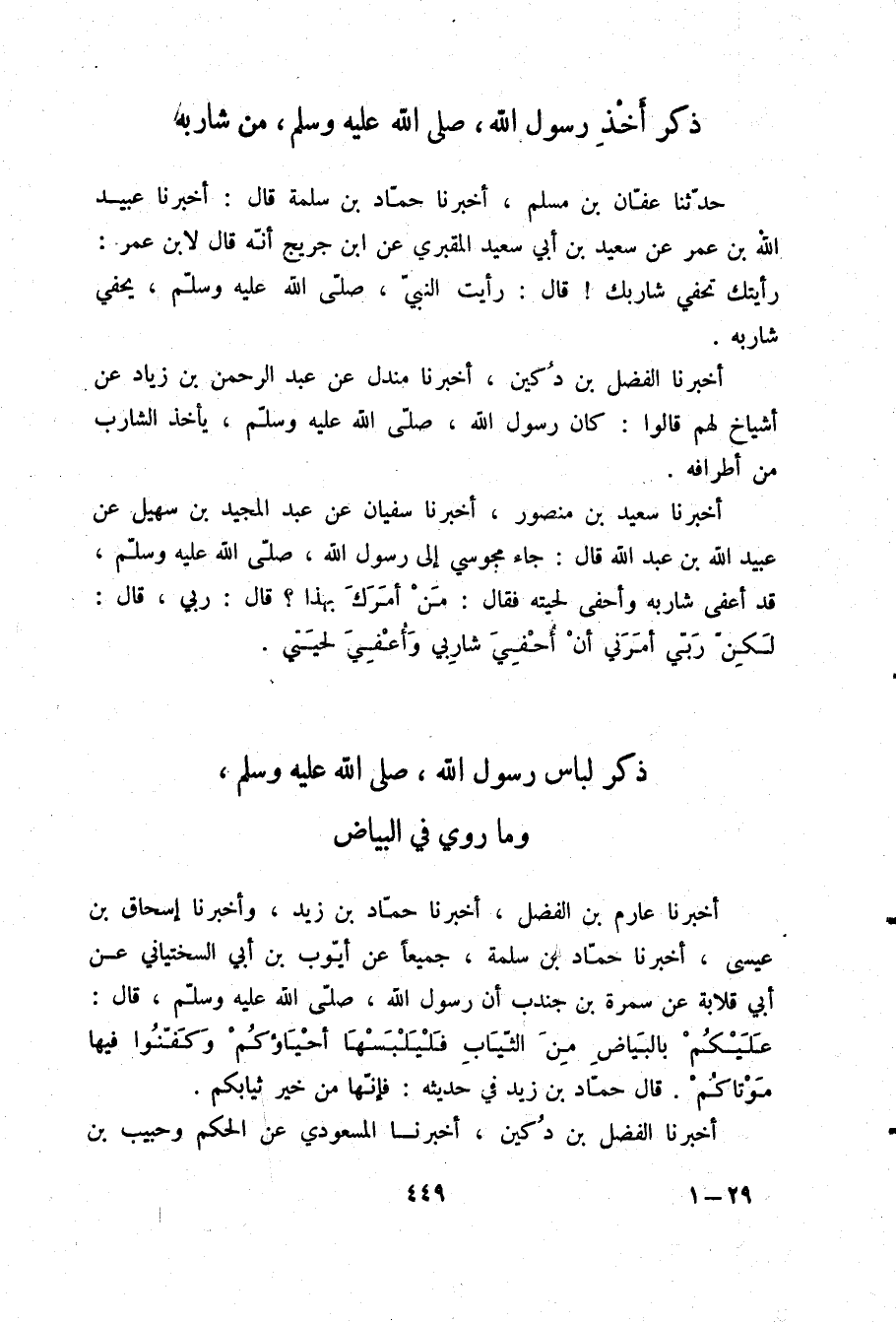 أَخْبَرَنَا الْفَضْلُ بْنُ دُكَيْنٍ، أَخْبَرَنَا مِنْدَلٌ، عَنْ عَبْدِ الرَّحْمَنِ بْنِ زِيَادٍ، عَنْ أَشْيَاخٍ لَهُمْ قَالُوا: كَانَ رَسُولُ اللَّهِ صلّى الله عليه وسلم §يَأْخُذُ الشَّارِبَ مِنْ أَطْرَافِهِ
