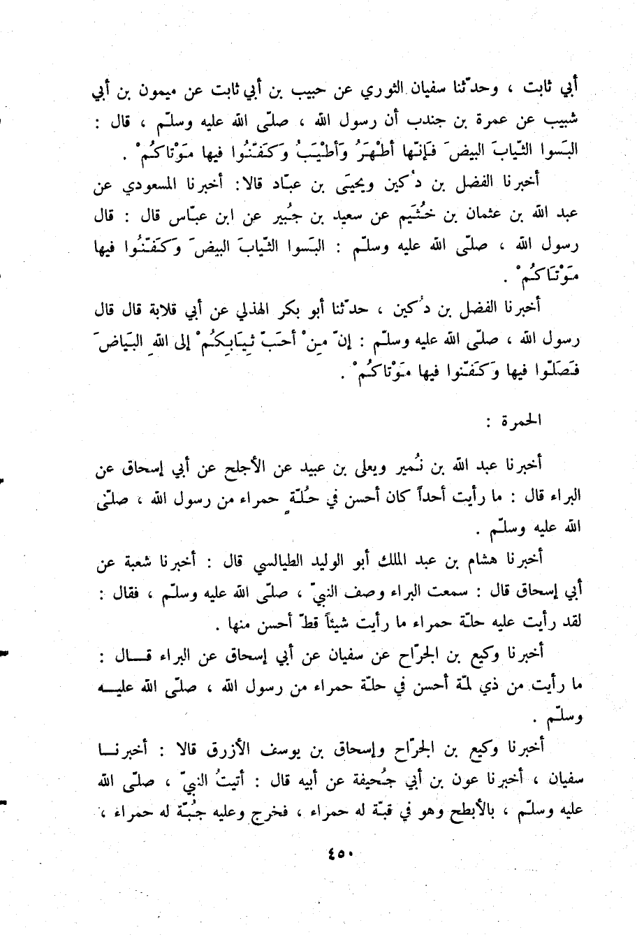 أَخْبَرَنَا هِشَامُ بْنُ عَبْدِ الْمَلِكِ أَبُو الْوَلِيدِ الطَّيَالِسِيُّ قَالَ: أَخْبَرَنَا شُعْبَةُ، عَنْ أَبِي إِسْحَاقَ قَالَ: سَمِعْتُ الْبَرَاءَ، وَصَفَ النَّبِيَّ صلّى الله عليه وسلم فَقَالَ: §لَقَدْ رَأَيْتُ عَلَيْهِ حُلَّةً حَمْرَاءَ مَا رَأَيْتُ شَيْئًا قَطُّ أَحْسَنَ مِنْهَا
