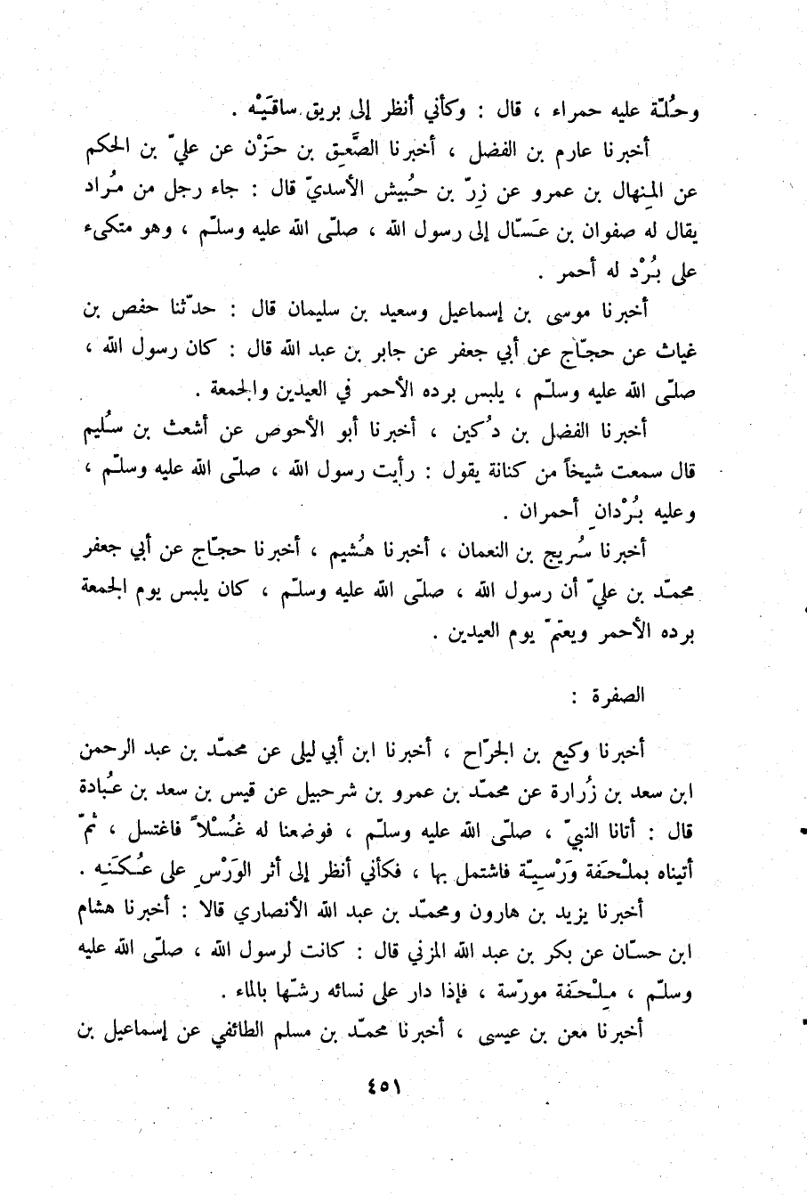 أَخْبَرَنَا سُرَيْجُ بْنُ النُّعْمَانِ، أَخْبَرَنَا هُشَيْمٌ، أَخْبَرَنَا حَجَّاجٌ، عَنْ أَبِي جَعْفَرٍ مُحَمَّدِ بْنِ عَلِيٍّ " أَنَّ رَسُولَ اللَّهِ صلّى الله عليه وسلم كَانَ §يَلْبَسُ يَوْمَ الْجُمُعَةِ بُرْدَهُ الْأَحْمَرَ وَيَعْتَمُّ يَوْمَ الْعِيدَيْنِ