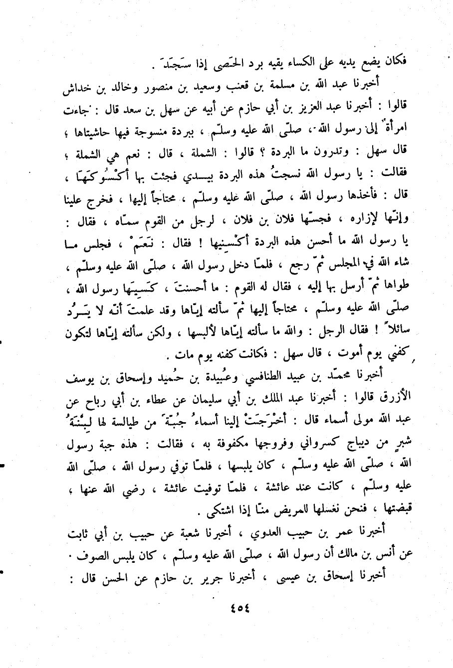 أَخْبَرَنَا عَبْدُ اللَّهِ بْنُ مَسْلَمَةَ بْنِ قَعْنَبٍ، وَسَعِيدُ بْنُ مَنْصُورٍ، وَخَالِدُ بْنُ خِدَاشٍ، قَالُوا: أَخْبَرَنَا عَبْدُ الْعَزِيزِ بْنُ أَبِي حَازِمٍ، عَنْ أَبِيهِ، عَنْ سَهْلِ بْنِ سَعْدٍ قَالَ: §جَاءَتِ امْرَأَةٌ إِلَى رَسُولِ اللَّهِ صلّى الله عليه وسلم بِبُرْدَةٍ مَنْسُوجَةٍ فِيهَا حَاشِيَتَاهَا قَالَ سَهْلٌ: وَتَدْرُونَ مَا الْبُرْدَةُ؟ قَالُوا: الشَّمْلَةُ قَالَ: نَعَمْ هِيَ الشَّمْلَةُ فَقَالَتْ: يَا رَسُولَ اللَّهِ نَسَجْتُ هَذِهِ الْبُرْدَةَ بِيَدِي فَجِئْتُ بِهَا أَكْسُوكَهَا قَالَ فَأَخَذَهَا رَسُولُ اللَّهِ صلّى الله عليه وسلم مُحْتَاجًا إِلَيْهَا فَخَرَجَ عَلَيْنَا وَإِنَّهَا لَإِزَارُهُ فَجَسَّهَا فُلَانُ بْنُ فُلَانٍ لِرَجُلٍ مِنَ الْقَوْمِ سَمَّاهُ فَقَالَ: يَا رَسُولَ اللَّهِ مَا أَحْسَنَ هَذِهِ الْبُرْدَةِ اكْسُنِيهَا فَقَالَ: «نَعَمْ» ، فَجَلَسَ مَا شَاءَ اللَّهُ فِي الْمَجْلِسِ ثُمَّ رَجَعَ فَلَمَّا دَخَلَ رَسُولُ اللَّهِ صلّى الله عليه وسلم طَوَاهَا ثُمَّ أَرْسَلَ بِهَا إِلَيْهِ فَقَالَ لَهُ الْقَوْمُ: مَا أَحْسَنْتَ، كَسِيهَا رَسُولُ اللَّهِ صلّى الله عليه وسلم مُحْتَاجًا إِلَيْهَا ثُمَّ سَأَلْتَهُ إِيَّاهَا وَقَدْ عَلِمْتَ أَنَّهُ لَا يَرُدُّ سَائِلًا فَقَالَ الرَّجُلُ: وَاللَّهِ مَا سَأَلْتُهُ إِيَّاهَا لِأَلْبَسَهَا وَلَكِنْ سَأَلْتُهُ إِيَّاهَا لِتَكُونَ كَفَنِي يَوْمَ أَمُوتُ قَالَ سَهْلٌ: فَكَانَتْ كَفَنَهُ يَوْمَ مَاتَ