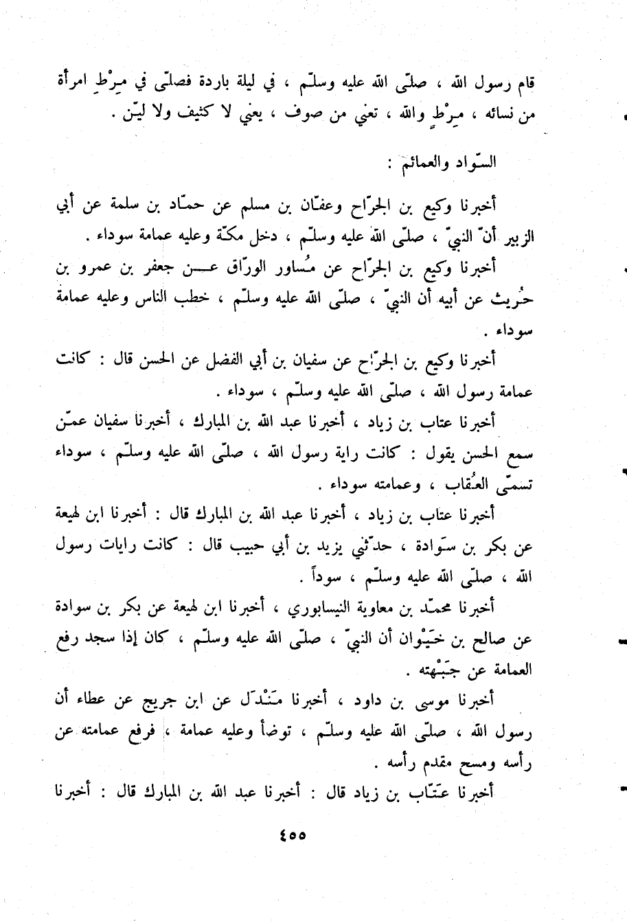 أَخْبَرَنَا وَكِيعُ بْنُ الْجَرَّاحِ، عَنْ سُفْيَانَ بْنِ أَبِي الْفَضْلِ، عَنِ الْحَسَنِ قَالَ: كَانَتْ §عِمَامَةُ رَسُولِ اللَّهِ صلّى الله عليه وسلم سَوْدَاءَ