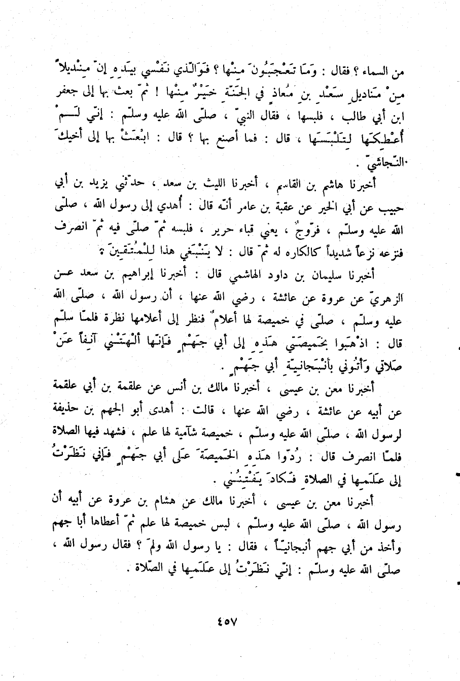 أَخْبَرَنَا سُلَيْمَانُ بْنُ دَاوُدَ الْهَاشِمِيُّ قَالَ: أَخْبَرَنَا إِبْرَاهِيمُ بْنُ سَعْدٍ، عَنِ الزُّهْرِيِّ، عَنْ عُرْوَةَ، عَنْ عَائِشَةَ رَضِيَ اللَّهُ عَنْهَا أَنَّ رَسُولَ اللَّهِ صلّى الله عليه وسلم صَلَّى فِي خَمِيصَةٍ لَهَا أَعْلَامٌ فَنَظَرَ إِلَى أَعْلَامِهَا نَظْرَةً فَلَمَّا سَلَّمَ قَالَ: «§اذْهَبُوا بِخَمِيصَتِي هَذِهِ إِلَى أَبِي جَهْمٍ فَإِنَّهَا أَلْهَتْنِي آنِفًا عَنْ صَلَاتِي وَأْتُونِي بِأَنْبَجَانِيَّةِ أَبِي جَهْمٍ»