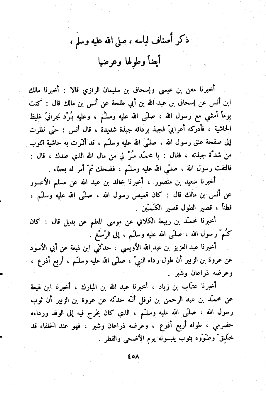 أَخْبَرَنَا سَعِيدُ بْنُ مَنْصُورٍ، أَخْبَرَنَا خَالِدُ بْنُ عَبْدِ اللَّهِ، عَنْ مُسْلِمٍ الْأَعْوَرِ، عَنْ أَنَسِ بْنِ مَالِكٍ قَالَ كَانَ: §قَمِيصُ رَسُولِ اللَّهِ صلّى الله عليه وسلم قُطْنًا قَصِيرَ الطُّوَلِ قَصِيرَ الْكُمَّيْنِ