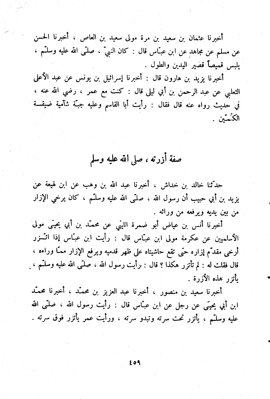 أَخْبَرَنَا أَنَسُ بْنُ عِيَاضٍ أَبُو ضَمْرَةَ اللَّيْثِيُّ، عَنْ مُحَمَّدِ بْنِ أَبِي يَحْيَى، مَوْلَى الْأَسْلَمِيِّينَ عَنْ عِكْرِمَةَ، مَوْلَى ابْنِ عَبَّاسٍ قَالَ: رَأَيْتُ ابْنَ عَبَّاسٍ إِذَا اتَّزَرَ أَرْخَى مُقَدَّمَ إِزَارِهِ حَتَّى تَقَعَ حَاشِيَتَاهُ عَلَى ظَهْرِ قَدَمَيْهِ وَيَرْفَعُ الْإِزَارَ مِمَّا وَرَاءَهُ قَالَ فَقُلْتُ لَهُ: لِمَ تَأْتَزِرُ هَكَذَا؟ قَالَ: §رَأَيْتُ رَسُولَ اللَّهِ صلّى الله عليه وسلم يَأْتَزِرُ هَذِهِ الْأُزْرَةَ