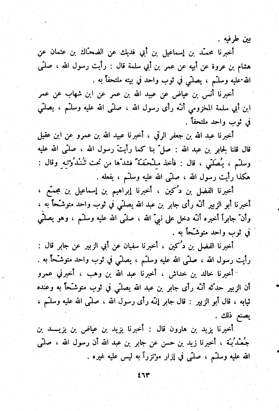 أَخْبَرَنَا الْفَضْلُ بْنُ دُكَيْنٍ، أَخْبَرَنَا إِبْرَاهِيمُ بْنُ إِسْمَاعِيلَ بْنِ مُجَمِّعٍ، أَخْبَرَنَا أَبُو الزُّبَيْرِ، أَنَّهُ رَأَى جَابِرَ بْنَ عَبْدِ اللَّهِ §يُصَلِّي فِي ثَوْبٍ وَاحِدٍ مُتَوَشِّحًا بِهِ وَأَنَّ جَابِرًا أَخْبَرَهُ أَنَّهُ دَخَلَ عَلَى نَبِيِّ اللَّهِ صلّى الله عليه وسلم وَهُوَ يُصَلِّي فِي ثَوْبٍ وَاحِدٍ مُتَوَشِّحًا بِهِ