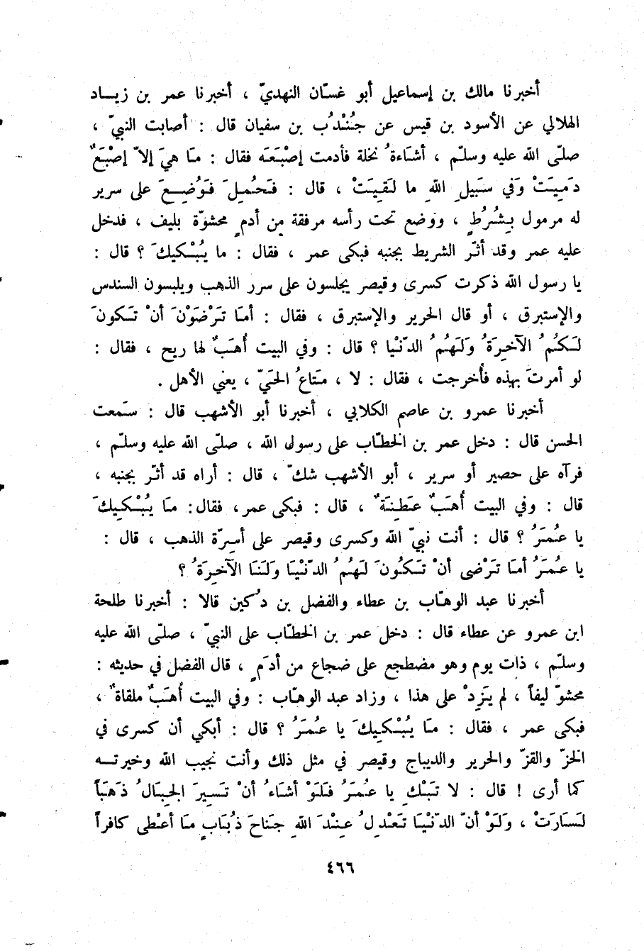 أَخْبَرَنَا مَالِكُ بْنُ إِسْمَاعِيلَ أَبُو غَسَّانَ النَّهْدِيُّ، أَخْبَرَنَا عُمَرُ بْنُ زِيَادٍ الْهِلَالِيُّ، عَنِ الْأَسْوَدِ بْنِ قَيْسٍ، عَنْ جُنْدُبِ بْنِ سُفْيَانَ قَالَ: أَصَابَتِ النَّبِيُّ صلّى الله عليه وسلم أُشَاءَةُ نَخْلَةٍ فَأَدْمَتْ إِصْبَعَهُ فَقَالَ: «§مَا هِيَ إِلَّا إِصْبَعٌ دَمِيَتْ وَفِي سَبِيلِ اللَّهِ مَا لَقِيتُ» قَالَ: فَحُمِلَ فَوُضِعَ عَلَى سَرِيرٍ مَرْمُولٍ بِشُرُطٍ وَوُضِعَ تَحْتَ رَأْسِهِ مِرْفَقَةٌ مِنْ أَدَمٍ مَحْشُوَّةً بِلِيفٍ فَدَخَلَ عَلَيْهِ عُمَرُ وَقَدْ أَثَّرَ الشَّرِيطُ بِجَنْبِهِ فَبَكَى عُمَرُ فَقَالَ: «مَا يُبْكِيكَ؟» قَالَ: يَا رَسُولَ اللَّهِ ذَكَرْتُ كِسْرَى وَقَيْصَرَ يَجْلِسُونَ عَلَى سُرَرِ الذَّهَبِ وَيَلْبَسُونَ السُّنْدُسَ وَالْإِسْتَبْرَقَ أَوْ قَالَ الْحَرِيرَ وَالْإِسْتَبْرَقَ فَقَالَ: «أَمَا تَرْضَوْنَ أَنْ تَكُونَ لَكُمُ الْآخِرَةُ وَلَهُمُ الدُّنْيَا» قَالَ: وَفِي الْبَيْتِ أُهَبٌ لَهَا رِيحٌ فَقَالَ: «لَوْ أَمَرْتَ بِهَذِهِ فَأُخْرِجَتْ» ، فَقَالَ: لَا، مَتَاعُ الْحَيِّ يَعْنِي الْأَهْلَ