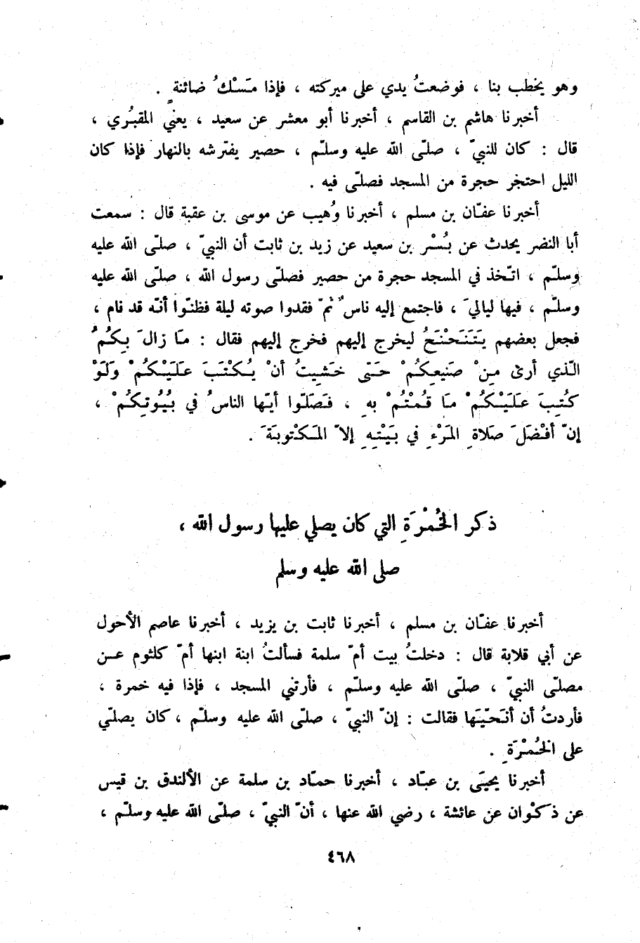 أَخْبَرَنَا عَفَّانُ بْنُ مُسْلِمٍ، أَخْبَرَنَا وُهَيْبٌ، عَنْ مُوسَى بْنِ عُقْبَةَ قَالَ: سَمِعْتُ أَبَا النَّضْرِ، يُحَدِّثُ عَنْ بُسْرِ بْنِ سَعِيدٍ، عَنْ زَيْدِ بْنِ ثَابِتٍ، أَنَّ النَّبِيَّ صلّى الله عليه وسلم اتَّخَذَ فِي الْمَسْجِدِ حُجْرَةً مِنْ حَصِيرٍ فَصَلَّى رَسُولُ اللَّهِ صلّى الله عليه وسلم فِيهَا لَيَالِي فَاجْتَمَعَ إِلَيْهِ نَاسٌ ثُمَّ فَقَدُوا صَوْتَهُ لَيْلَةً فَظُنُّوا أَنَّهُ قَدْ نَامَ فَجَعَلَ بَعْضُهُمْ يَتَنَحْنَحُ لِيَخْرُجَ إِلَيْهِمْ فَخَرَجَ إِلَيْهِمْ فَقَالَ: «مَا زَالَ بِكُمُ الَّذِي أَرَى مِنْ صَنِيعِكُمْ حَتَّى خَشِيتُ أَنْ يُكْتُبَ عَلَيْكُمْ وَلَوْ كُتِبَ عَلَيْكُمْ مَا قُمْتُمْ بِهِ فَصَلُّوا أَيُّهَا النَّاسُ فِي بُيُوتِكُمْ إِنَّ §أَفْضَلَ صَلَاةِ الْمَرْءِ فِي بَيْتِهِ إِلَّا الْمَكْتُوبَةَ»