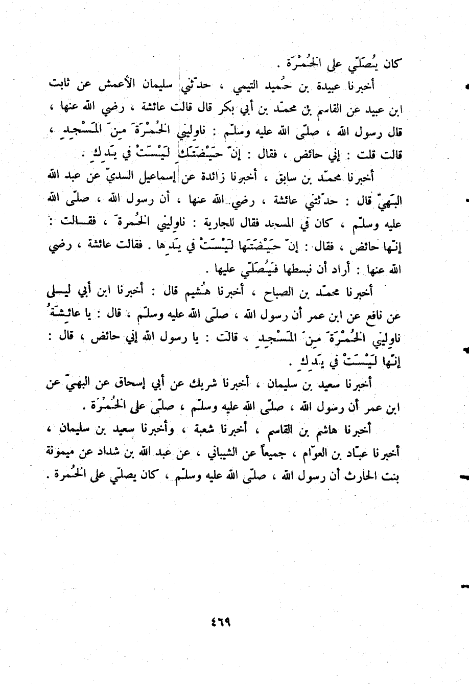 أَخْبَرَنَا مُحَمَّدُ بْنُ سَابِقٍ، أَخْبَرَنَا زَائِدَةُ، عَنْ إِسْمَاعِيلَ السُّدِّيِّ، عَنْ عَبْدِ اللَّهِ الْبَهِيِّ قَالَ: حَدَّثَتْنِي عَائِشَةُ رَضِيَ اللَّهُ عَنْهَا أَنَّ رَسُولَ اللَّهِ صلّى الله عليه وسلم كَانَ فِي الْمَسْجِدِ فَقَالَ لِلْجَارِيَةِ: «نَاوِلِينِي الْخُمْرَةَ» ، فَقَالَتْ: إِنَّهَا حَائِضٌ فَقَالَ: «إِنَّ §حَيْضَتَهَا لَيْسَتْ فِي يَدِهَا» ، فَقَالَتْ عَائِشَةُ رَضِيَ اللَّهُ عَنْهَا: أَرَادَ أَنْ نَبْسُطَهَا فَيُصَلِّي عَلَيْهَا