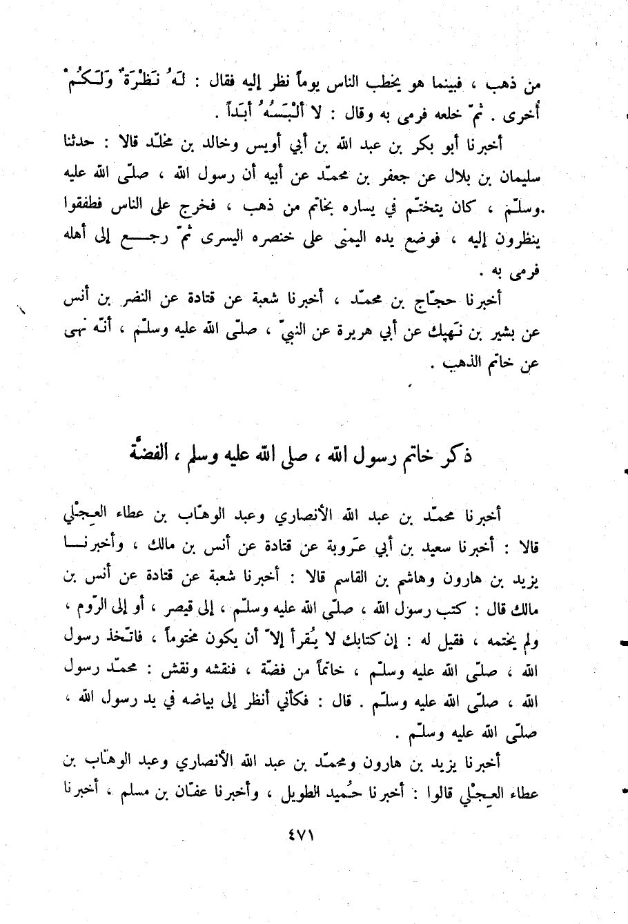 أَخْبَرَنَا مُحَمَّدُ بْنُ عَبْدِ اللَّهِ الْأَنْصَارِيُّ، وَعَبْدُ الْوَهَّابِ بْنُ عَطَاءٍ الْعِجْلِيُّ قَالَا: أَخْبَرَنَا سَعِيدُ بْنُ أَبِي عَرُوبَةَ، عَنْ قَتَادَةَ، عَنْ أَنَسِ بْنِ مَالِكٍ، وَأَخْبَرَنَا يَزِيدُ بْنُ هَارُونَ، وَهَاشِمُ بْنُ الْقَاسِمِ قَالَا: أَخْبَرَنَا شُعْبَةُ، عَنْ قَتَادَةَ، عَنْ أَنَسِ بْنِ مَالِكٍ قَالَ: كَتَبَ رَسُولُ اللَّهِ صلّى الله عليه وسلم إِلَى قَيْصَرَ أَوْ إِلَى الرُّومِ وَلَمْ يَخْتِمْهُ فَقِيلَ لَهُ: إِنَّ كِتَابَكَ لَا يَقْرَأُ إِلَّا أَنْ يَكُونَ مَخْتُومًا §فَاتَّخَذَ رَسُولُ اللَّهِ صلّى الله عليه وسلم خَاتَمًا مِنْ فِضَّةٍ فَنَقَشَهُ وَنَقَشَ: مُحَمَّدٌ رَسُولُ اللَّهِ صلّى الله عليه وسلم قَالَ: فَكَأَنِّي أَنْظُرُ إِلَى بَيَاضِهِ فِي يَدِ رَسُولِ اللَّهِ صلّى الله عليه وسلم
