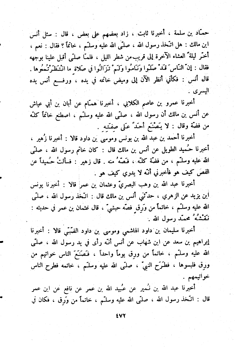 أَخْبَرَنَا عَمْرُو بْنُ عَاصِمٍ الْكِلَابِيُّ، أَخْبَرَنَا هَمَّامٌ، عَنْ أَبَانَ بْنِ أَبِي عَيَّاشٍ، عَنْ أَنَسِ بْنِ مَالِكٍ، أَنَّ رَسُولَ اللَّهِ صلّى الله عليه وسلم §اصْطَنَعَ خَاتَمًا كُلَّهُ مِنْ فِضَّةٍ وَقَالَ: «لَا يَصْنَعُ أَحَدٌ عَلَى صِفَتِهِ»