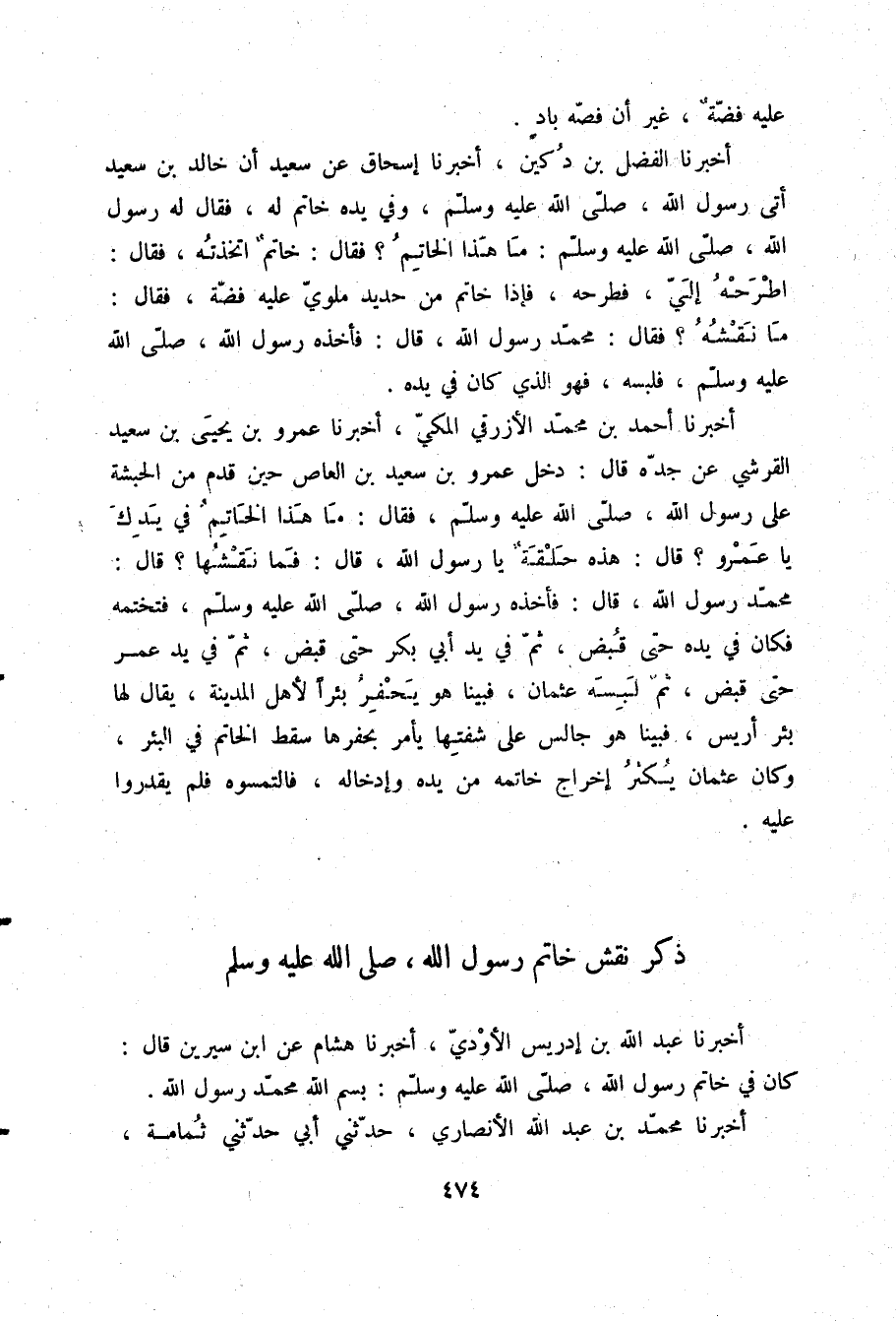 أَخْبَرَنَا أَحْمَدُ بْنُ مُحَمَّدٍ الْأَزْرَقِيُّ الْمَكِّيُّ، أَخْبَرَنَا عَمْرُو بْنُ يَحْيَى بْنِ سَعِيدٍ الْقُرَشِيُّ، عَنْ جَدِّهِ، قَالَ: دَخَلَ عَمْرُو بْنُ سَعِيدِ بْنِ الْعَاصِ حِينَ قَدِمَ مِنَ الْحَبَشَةِ عَلَى رَسُولِ اللَّهِ صلّى الله عليه وسلم فَقَالَ: «§مَا هَذَا الْخَاتَمُ فِي يَدِكَ يَا عَمْرُو؟» قَالَ: هَذِهِ حَلْقَةٌ يَا رَسُولَ اللَّهِ قَالَ: «فَمَا نَقْشُهَا؟» قَالَ " مُحَمَّدٌ رَسُولُ اللَّهِ قَالَ فَأَخَذَهُ رَسُولُ اللَّهِ صلّى الله عليه وسلم فَتَخَتَّمَهُ فَكَانَ فِي يَدِهِ حَتَّى قُبِضَ ثُمَّ فِي يَدِ أَبِي بَكْرٍ حَتَّى قُبِضَ ثُمَّ فِي يَدِ عُمَرَ حَتَّى قُبِضَ ثُمَّ لَبِسَهُ عُثْمَانُ فَبَيْنَا هُوَ يَحْفِرُ بِئْرًا لِأَهْلِ الْمَدِينَةِ يُقَالُ لَهَا: بِئْرُ أَرِيسٍ فَبَيْنَا هُوَ جَالِسٌ عَلَى شَفَتِهَا يَأْمُرُ بِحَفْرِهَا سَقَطَ الْخَاتَمُ فِي الْبِئْرِ وَكَانَ عُثْمَانُ يُكْثِرُ إِخْرَاجَ خَاتَمَهُ مِنْ يَدِهِ وَإِدْخَالَهُ فَالْتَمَسُوهُ فَلَمْ يَقْدِرُوا عَلَيْهِ