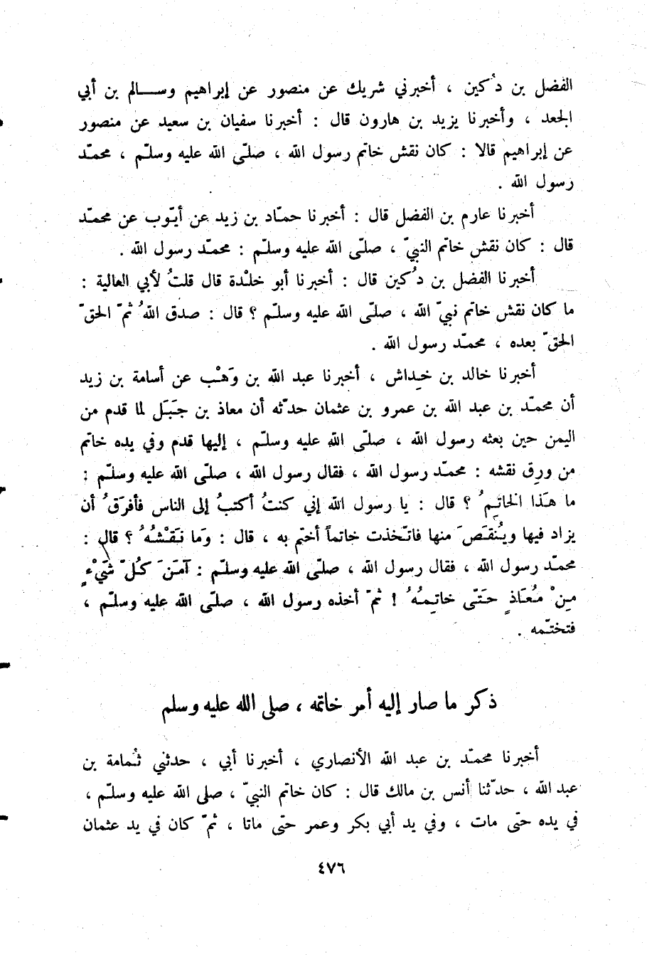 أَخْبَرَنَا عَارِمُ بْنُ الْفَضْلِ قَالَ: أَخْبَرَنَا حَمَّادُ بْنُ زَيْدٍ، عَنْ أَيُّوبَ، عَنْ مُحَمَّدٍ قَالَ: كَانَ §نَقْشُ خَاتَمِ النَّبِيِّ صلّى الله عليه وسلم: مُحَمَّدٌ رَسُولُ اللَّهِ