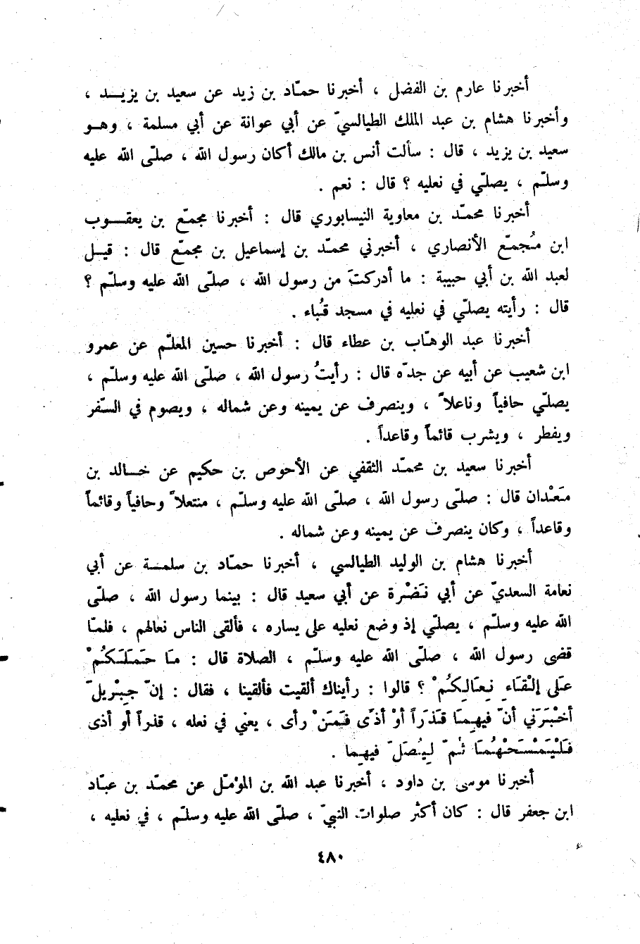 أَخْبَرَنَا عَارِمُ بْنُ الْفَضْلِ، أَخْبَرَنَا حَمَّادُ بْنُ زَيْدٍ، عَنْ سَعِيدِ بْنِ يَزِيدَ، وَأَخْبَرَنَا هِشَامُ بْنُ عَبْدِ الْمَلِكِ الطَّيَالِسِيُّ، عَنْ أَبِي عَوَانَةَ، عَنْ أَبِي مَسْلَمَةَ، وَهُوَ سَعِيدُ بْنُ يَزِيدَ قَالَ: سَأَلْتُ أَنَسَ بْنَ مَالِكٍ §أَكَانَ رَسُولُ اللَّهِ صلّى الله عليه وسلم يُصَلِّي فِي نَعْلَيْهِ؟ قَالَ: نَعَمْ