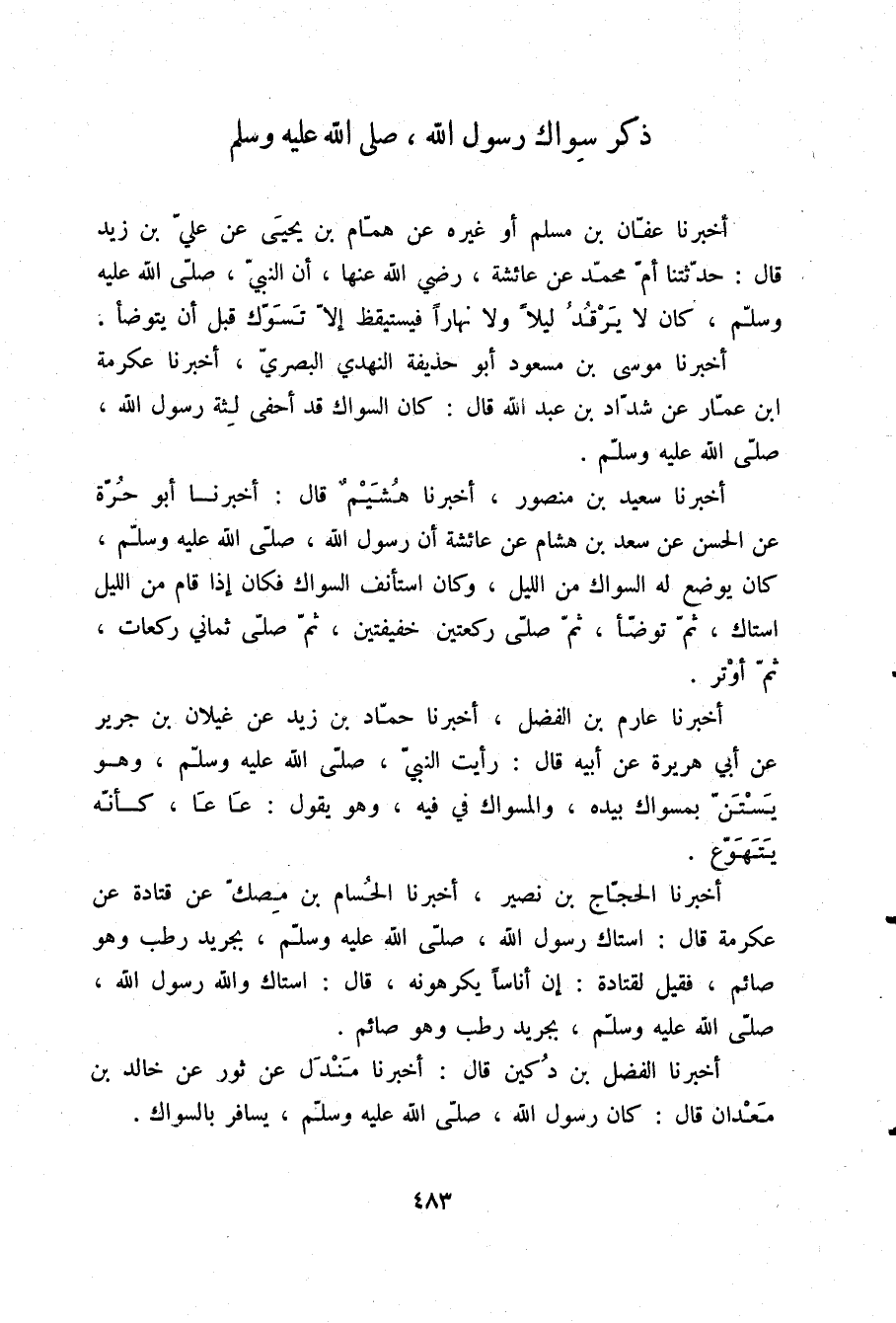 أَخْبَرَنَا مُوسَى بْنُ مَسْعُودٍ أَبُو حُذَيْفَةَ النَّهْدِيُّ الْبَصْرِيُّ، أَخْبَرَنَا عِكْرِمَةُ بْنُ عَمَّارٍ، عَنْ شَدَّادِ بْنِ عَبْدِ اللَّهِ قَالَ: كَانَ §السِّوَاكُ قَدْ أَحْفَى لِثَّةَ رَسُولِ اللَّهِ صلّى الله عليه وسلم
