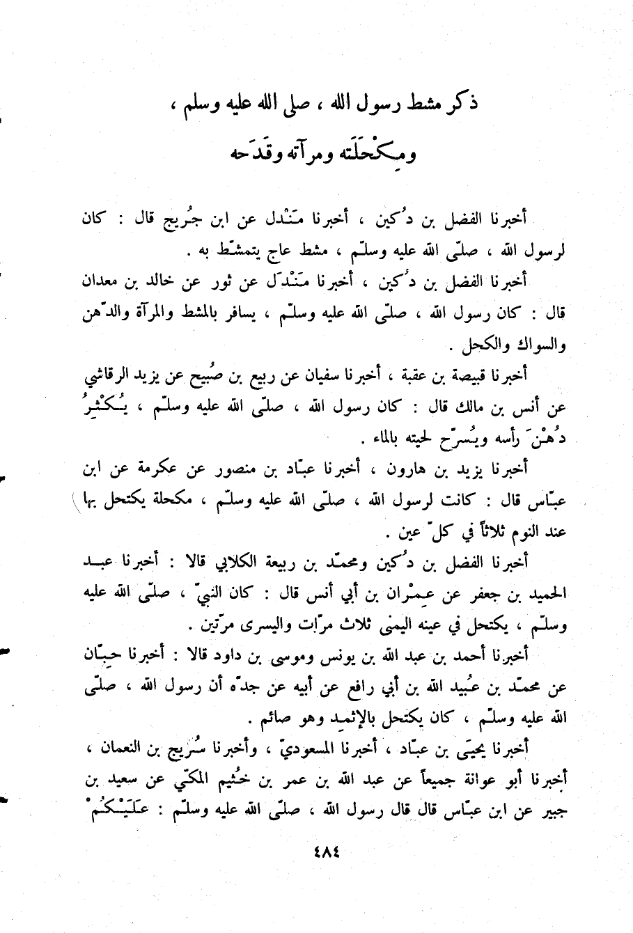 أَخْبَرَنَا الْفَضْلُ بْنُ دُكَيْنٍ، وَمُحَمَّدُ بْنُ رَبِيعَةَ الْكِلَابِيُّ قَالَا: أَخْبَرَنَا عَبْدُ الْحَمِيدِ بْنُ جَعْفَرٍ، عَنْ عِمْرَانَ بْنِ أَبِي أَنَسٍ قَالَ: كَانَ النَّبِيُّ صلّى الله عليه وسلم §يَكْتَحِلُ فِي عَيْنِهِ الْيُمْنَى ثَلَاثَ مَرَّاتٍ وَالْيُسْرَى مَرَّتَيْنِ