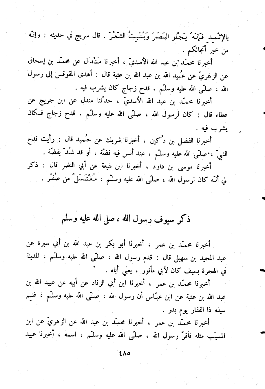 أَخْبَرَنَا مُحَمَّدُ بْنُ عُمَرَ، أَخْبَرَنَا ابْنُ أَبِي الزِّنَادِ، عَنْ أَبِيهِ، عَنْ عُبَيْدِ اللَّهِ بْنِ عَبْدِ اللَّهِ بْنِ عُتْبَةَ، عَنِ ابْنِ عَبَّاسٍ، " أَنَّ رَسُولَ اللَّهِ صلّى الله عليه وسلم §غَنِمَ سَيْفَهُ ذَا الْفَقَارِ يَوْمَ بَدْرٍ أَخْبَرَنَا مُحَمَّدُ بْنُ عُمَرَ، أَخْبَرَنَا مُحَمَّدُ بْنُ عَبْدِ اللَّهِ، عَنِ الزُّهْرِيِّ، عَنِ ابْنِ الْمُسَيَّبِ، مِثْلَهُ فَأَقَرَّ رَسُولُ اللَّهِ صلّى الله عليه وسلم اسْمَهُ