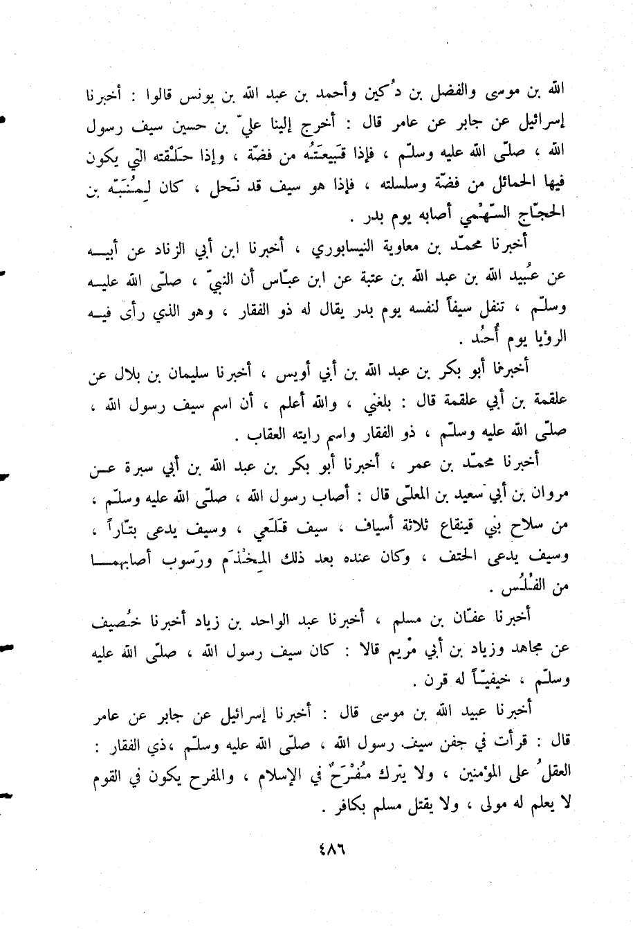 أَخْبَرَنَا عُبَيْدُ اللَّهِ بْنُ مُوسَى قَالَ: أَخْبَرَنَا إِسْرَائِيلُ، عَنْ جَابِرٍ، عَنْ عَامِرٍ قَالَ: §قَرَأْتُ فِي جَفْنِ سَيْفِ رَسُولِ اللَّهِ صلّى الله عليه وسلم ذِي الْفَقَارِ: الْعَقْلُ عَلَى الْمُؤْمِنِينَ وَلَا يُتْرَكْ مُفَرَّحٌ فِي الْإِسْلَامِ وَالْمُفَرَّحُ يَكُونُ فِي الْقَوْمِ لَا يُعْلَمُ لَهُ مَوْلًى وَلَا يُقْتَلْ مُسْلِمٌ بِكَافِرٍ