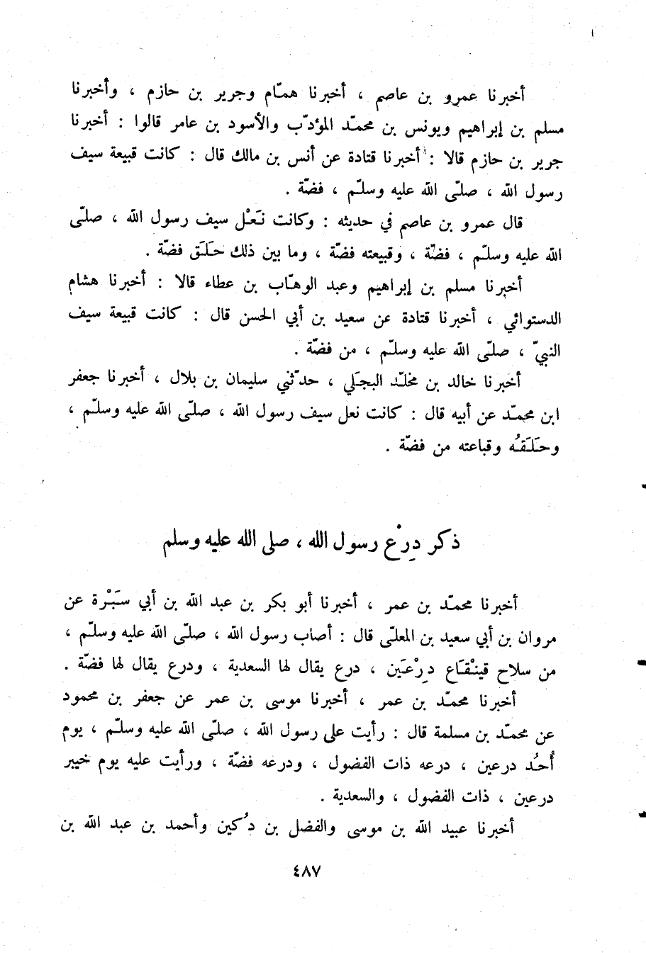 أَخْبَرَنَا عَمْرُو بْنُ عَاصِمٍ، أَخْبَرَنَا هَمَّامٌ، وَجَرِيرُ بْنُ حَازِمٍ، وَأَخْبَرَنَا مُسْلِمُ بْنُ إِبْرَاهِيمَ، وَيُونُسُ بْنُ مُحَمَّدٍ الْمُؤَدِّبُ، وَالْأَسْوَدُ بْنُ عَامِرٍ، قَالُوا: أَخْبَرَنَا جَرِيرُ بْنُ حَازِمٍ قَالَا: أَخْبَرَنَا قَتَادَةُ، عَنْ أَنَسِ بْنِ مَالِكٍ قَالَ: كَانَتْ §قَبِيعَةُ سَيْفِ رَسُولِ اللَّهِ صلّى الله عليه وسلم فِضَّةً قَالَ عَمْرُو بْنُ عَاصِمٍ فِي حَدِيثِهِ: وَكَانَتْ نَعْلُ سَيْفِ رَسُولِ اللَّهِ صلّى الله عليه وسلم فِضَّةً وَقَبِيعَتُهُ فِضَّةً وَمَا بَيْنَ ذَلِكَ حِلَقُ فِضَّةٍ