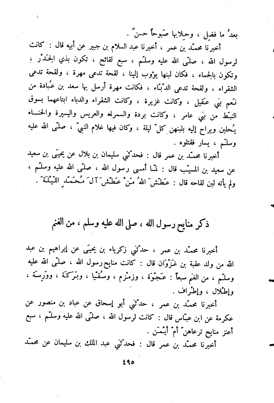 أَخْبَرَنَا مُحَمَّدُ بْنُ عُمَرَ قَالَ: فَحَدَّثَنِي عَبْدُ الْمَلِكِ بْنُ سُلَيْمَانَ، عَنْ مُحَمَّدِ -[496]- بْنِ عَبْدِ اللَّهِ بْنِ الْحُصَيْنِ قَالَ: كَانَتْ §مَنَايِحُ رَسُولِ اللَّهِ صلّى الله عليه وسلم تُرْعَى بِأُحُدٍ وَتَرُوحُ كُلَّ لَيْلَةٍ عَلَى الْبَيْتِ الَّذِي يَدُورُ فِيهِ رَسُولُ اللَّهِ صلّى الله عليه وسلم