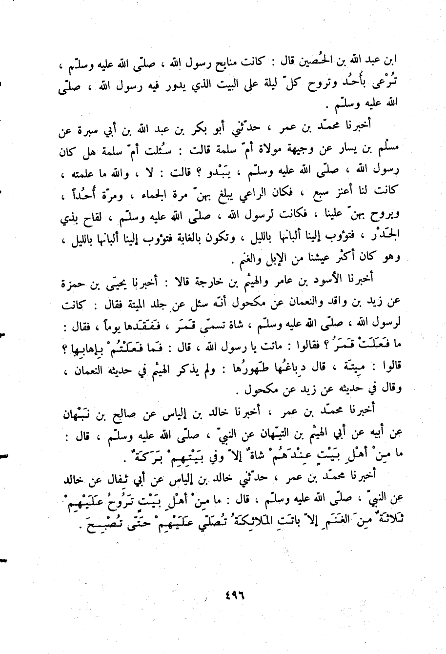 أَخْبَرَنَا مُحَمَّدُ بْنُ عُمَرَ، حَدَّثَنِي خَالِدُ بْنُ إِلْيَاسَ، عَنْ أَبِي ثِفَالٍ، عَنْ خَالِدٍ، عَنِ النَّبِيِّ صلّى الله عليه وسلم قَالَ: «§مَا مِنْ أَهْلِ بَيْتٍ تَرُوحُ عَلَيْهِمْ ثَلَاثَةٌ مِنَ الْغَنَمِ إِلَّا بَاتَتِ الْمَلَائِكَةُ تُصَلِّي عَلَيْهِمْ حَتَّى تُصْبِحَ»