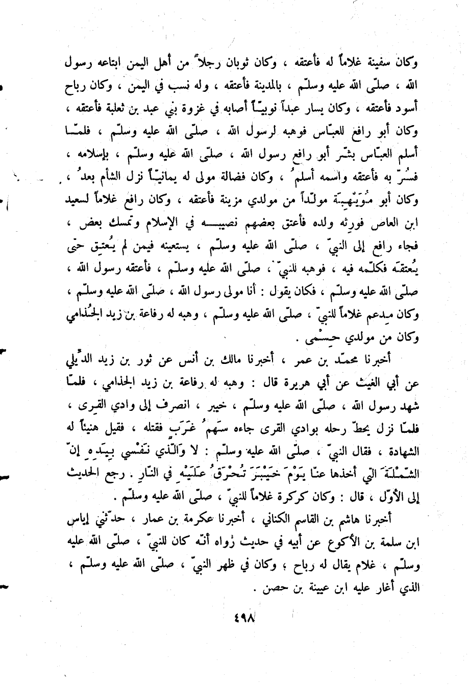 وَكَانَ سَفِينَةُ غُلَامًا لَهُ فَأَعْتَقَهُ وَكَانَ ثَوْبَانُ رَجُلًا مِنْ أَهْلِ الْيَمَنِ ابْتَاعَهُ رَسُولُ اللَّهِ صلّى الله عليه وسلم بِالْمَدِينَةِ فَأَعْتَقَهُ وَلَهُ نَسَبٌ فِي الْيَمَنِ وَكَانَ رَبَاحٌ أَسْوَدَ فَأَعْتَقَهُ وَكَانَ يَسَارٌ عَبْدًا نُوبِيًّا أَصَابَهُ فِي غَزْوَةِ بَنِي عَبْدِ بْنِ ثَعْلَبَةَ فَأَعْتَقَهُ وَكَانَ أَبُو رَافِعٍ لِلْعَبَّاسِ فَوَهَبَهُ لِرَسُولِ اللَّهِ صلّى الله عليه وسلم فَلَمَّا أَسْلَمَ الْعَبَّاسُ بَشَّرَ أَبُو رَافِعٍ رَسُولَ اللَّهِ صلّى الله عليه وسلم بِإِسْلَامِهِ فَسُّرَ بِهِ فَأَعْتَقَهُ وَاسْمُهُ أَسْلَمُ وَكَانَ فَضَالَةُ مَوْلًى لَهُ يَمَانِيًّا نَزَلَ الشَّأْمَ بَعْدُ وَكَانَ أَبُو مُوَيْهِبَةَ مُوَلَّدًا مِنْ مُوَلِّدِي مُزَيْنَةَ فَأَعْتَقَهُ وَكَانَ رَافِعٌ غُلَامًا لِسَعِيدِ بْنِ الْعَاصِ فَوَرِثَهُ وَلَدُهُ فَأَعْتَقَ بَعْضُهُمْ نَصِيبَهُ فِي الْإِسْلَامِ وَتَمَسَّكَ بَعْضٌ فَجَاءَ رَافِعٌ إِلَى النَّبِيِّ صلّى الله عليه وسلم يَسْتَعِينُهُ فِيمَنْ لَمْ يُعْتِقْ حَتَّى يُعْتِقَهُ فَكَلَّمَهُ فِيهِ فَوَهَبَهُ لِلنَّبِيِّ صلّى الله عليه وسلم فَأَعْتَقَهُ رَسُولُ اللَّهِ صلّى الله عليه وسلم فَكَانَ يَقُولُ: أَنَا مَوْلَى رَسُولِ اللَّهِ صلّى الله عليه وسلم وَكَانَ مِدْعَمٌ غُلَامًا لِلنَّبِيِّ صلّى الله عليه وسلم وَهَبَهُ لَهُ رِفَاعَةُ بْنُ زَيْدٍ الْجُذَامِيُّ وَكَانَ مِنْ مُوَلِّدِي حِسْمَى