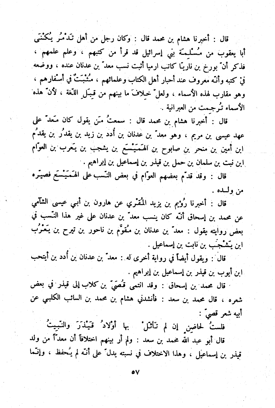 قَالَ: أَخْبَرَنَا هِشَامُ بْنُ مُحَمَّدٍ قَالَ: سَمِعْتُ مَنْ يَقُولُ: كَانَ §مَعَدٌّ عَلَى عَهْدِ عِيسَى ابْنِ مَرْيَمَ وَهُوَ مَعَدُّ بْنُ عَدْنَانَ بْنِ أُدَدَ بْنِ زَيْدِ بْنِ يَقْدِرَ بْنِ يَقْدَمَ بْنِ أَمِينِ بْنِ مَنْحَرِ بْنِ صَابُوحِ بْنِ الْهَمَيْسَعِ بْنِ يَشْجُبَ بْنِ يَعْرُبَ بْنِ الْعَوَّامِ بْنِ نَبْتِ بْنِ سَلْمَانَ بْنِ حَمَلِ بْنِ قَيْذَرَ بْنِ إِسْمَاعِيلَ بْنِ إِبْرَاهِيمَ قَالَ: وَقَدْ قَدَّمَ بَعْضُهُمُ الْعَوَّامَ فِي بَعْضِ النَّسَبِ عَلَى الْهَمَيْسَعِ فَصَيَّرَهُ مِنْ وَلَدِهِ