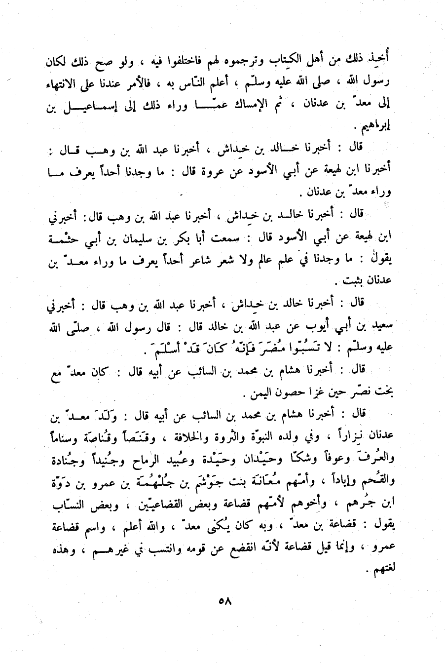 قَالَ: أَخْبَرَنَا خَالِدُ بْنُ خِدَاشٍ، أَخْبَرَنَا عَبْدُ اللَّهِ بْنُ وَهْبٍ قَالَ: أَخْبَرَنَا ابْنُ لَهِيعَةَ، عَنْ أَبِي الْأَسْوَدِ، عَنْ عُرْوَةَ قَالَ: §مَا وَجَدْنَا أَحَدًا يَعْرِفُ مَا وَرَاءَ مَعَدِّ بْنِ عَدْنَانَ