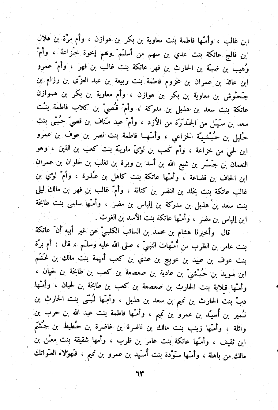 قَالَ: وَأَخْبَرَنَا هِشَامُ بْنُ مُحَمَّدِ بْنِ السَّائِبِ الْكَلْبِيُّ عَنْ غَيْرِ أَبِيهِ " أَنَّ §عَاتِكَةَ بِنْتَ عَامِرِ بْنِ الظَّرِبِ مِنْ أُمَّهَاتِ النَّبِيِّ صلّى الله عليه وسلم قَالَ: أُمُّ بَرَّةَ بِنْتُ عَوْفِ بْنِ عَبِيدِ بْنِ عَوِيجِ بْنِ عَدِيِّ بْنِ كَعْبٍ أُمَيْمَةُ بِنْتُ مَالِكِ بْنِ غَنْمِ بْنِ سُوَيْدِ بْنِ حُبْشِيِّ بْنِ عَادِيَةَ بْنِ صَعْصَعَةَ بْنِ كَعْبِ بْنِ طَابِخَةَ بْنِ لِحْيَانَ، وَأُمُّهَا قِلَابَةُ بِنْتُ الْحَارِثِ بْنِ صَعْصَعَةَ بْنِ كَعْبِ بْنِ طَابِخَةَ بْنِ لِحْيَانَ، وَأُمُّهَا دَبُّ بِنْتُ الْحَارِثِ بْنِ تَمِيمِ بْنِ سَعْدِ بْنِ هُذَيْلٍ، وَأُمُّهَا لُبْنَى بِنْتُ الْحَارِثِ بْنِ نُمَيْرِ بْنِ أَسِيدِ بْنِ عَمْرِو بْنِ تَمِيمٍ، وَأُمُّهَا فَاطِمَةُ بِنْتُ عَبْدِ اللَّهِ بْنِ حَرْبِ بْنِ وَائِلَةَ، وَأُمُّهَا زَيْنَبُ بِنْتُ مَالِكِ بْنِ نَاضِرَةَ بْنِ غَاضِرَةَ بْنِ حُطَيْطِ بْنِ جُشَمِ بْنِ ثَقِيفٍ، وَأُمُّهَا عَاتِكَةُ بِنْتُ عَامِرِ بْنِ ظَرِبٍ، وَأُمُّهَا شَقِيقَةُ بِنْتُ مَعْنِ بْنِ مَالِكٍ مِنْ بَاهِلَةَ، وَأُمُّهَا سَوْدَةُ بِنْتُ أَسِيدِ بْنِ عَمْرِو بْنِ تَمِيمٍ فَهَؤُلَاءِ الْعَوَاتِكُ