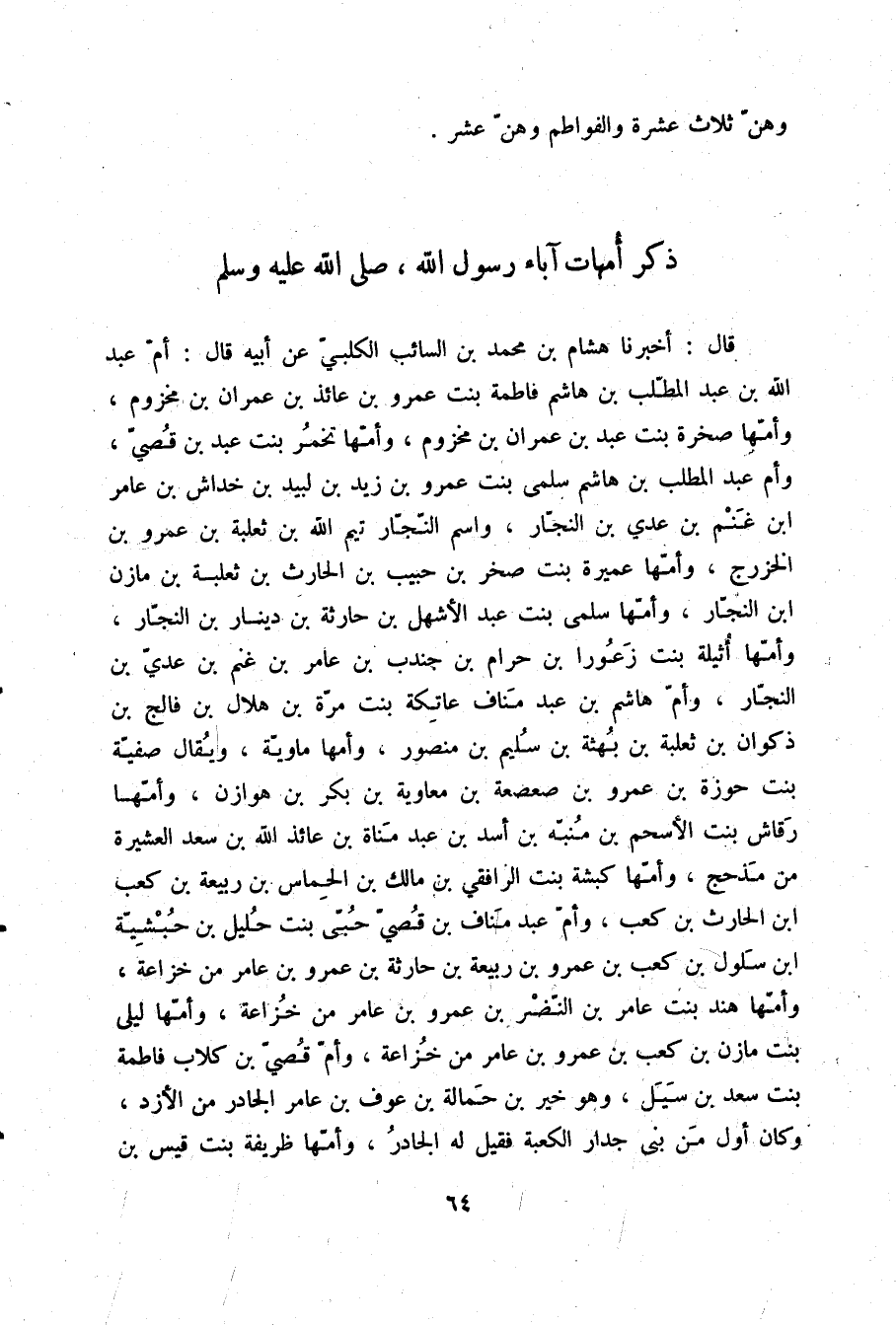 قَالَ: أَخْبَرَنَا هِشَامُ بْنُ مُحَمَّدِ بْنِ السَّائِبِ الْكَلْبِيُّ، عَنْ أَبِيهِ قَالَ: §أُمُّ عَبْدِ اللَّهِ بْنِ عَبْدِ الْمُطَّلِبِ بْنِ هَاشِمٍ فَاطِمَةُ بِنْتُ عَمْرِو بْنِ عَائِذِ بْنِ عِمْرَانَ بْنِ مَخْزُومٍ وَأُمُّهَا صَخْرَةُ بِنْتُ عَبْدِ بْنِ عِمْرَانَ بْنِ مَخْزُومٍ وَأُمُّهَا تَخْمُرُ بِنْتُ عَبْدِ بْنِ قُصَيٍّ، وَأُمُّ عَبْدِ الْمُطَّلِبِ بْنِ هَاشِمٍ سَلْمَى بِنْتُ عَمْرِو بْنِ زَيْدِ بْنِ لَبِيدِ بْنِ خِدَاشِ بْنِ عَامِرِ بْنِ غَنْمِ بْنِ عَدِيِّ بْنِ النَّجَّارِ وَاسْمُ النَّجَّارِ تَيْمُ اللَّهِ بْنُ ثَعْلَبَةَ بْنِ عَمْرِو بْنِ الْخَزْرَجِ وَأُمُّهَا عَمِيرَةُ بِنْتُ صَخْرِ بْنِ حَبِيبِ بْنِ الْحَارِثِ بْنِ ثَعْلَبَةَ بْنِ مَازِنِ بْنِ النَّجَّارِ وَأُمُّهَا سَلْمَى بِنْتُ عَبْدِ الْأَشْهَلَ بْنِ حَارِثَةَ بْنِ دِينَارِ بْنِ النَّجَّارِ وَأُمُّهَا أُثَيْلَةُ بِنْتُ زَعُورَا بْنِ حَرَامِ بْنِ جُنْدُبِ بْنِ عَامِرِ بْنِ غَنْمِ بْنِ عَدِيِّ بْنِ النَّجَّارِ، وَأُمُّ هَاشِمِ بْنِ عَبْدِ مَنَافٍ عَاتِكَةُ بِنْتُ مُرَّةَ بْنِ هِلَالِ بْنِ فَالِجِ بْنِ ذَكْوَانَ بْنِ ثَعْلَبَةَ بْنِ بَهْثَةَ بْنِ سُلَيْمِ بْنِ مَنْصُورٍ وَأُمُّهَا مَاوِيَّةُ وَيُقَالُ صَفِيَّةُ بِنْتُ حَوْزَةَ بْنِ عَمْرِو بْنِ صَعْصَعَةَ بْنِ مُعَاوِيَةَ بْنِ بَكْرِ بْنِ هَوَازِنَ وَأُمُّهَا رَقَاشُ بِنْتُ الْأَسْحَمِ بْنِ مُنَبِّهِ بْنِ أَسَدِ بْنِ عَبْدِ مَنَاةَ بْنِ عَائِذِ اللَّهِ بْنِ سَعْدٍ الْعَشِيرَةُ مِنْ مَذْحِجٍ وَأُمُّهَا كَبْشَةُ بِنْتُ الرَّافِقِيِّ بْنِ مَالِكِ بْنِ الْحَمَاسِ بْنِ رَبِيعَةَ بْنِ كَعْبِ بْنِ الْحَارِثِ بْنِ كَعْبٍ، وَأُمُّ عَبْدِ مَنَافِ بْنِ قُصَيٍّ حُبَّى بِنْتُ حَلِيلِ بْنِ حُبْشِيَّةَ ابْنِ سَلُولِ بْنِ كَعْبِ بْنِ عَمْرِو بْنِ رَبِيعَةَ بْنِ حَارِثَةَ بْنِ عَمْرِو بْنِ عَامِرٍ مِنْ خُزَاعَةَ وَأُمُّهَا هِنْدُ بِنْتُ عَامِرِ بْنِ النَّضْرِ بْنِ عَمْرِو بْنِ عَامِرٍ مِنْ خُزَاعَةَ وَأُمُّهَا لَيْلَى بِنْتُ مَازِنِ بْنِ كَعْبِ بْنِ عَمْرِو بْنِ عَامِرٍ مِنْ خُزَاعَةَ، وَأُمُّ قُصَيِّ بْنِ كِلَابٍ فَاطِمَةُ بِنْتُ سَعْدِ بْنِ سَيْلٍ وَهُوَ خَيْرُ بْنُ حَمَالَةَ بْنِ عَوْفِ بْنِ عَامِرٍ الْجَادِرُ مِنَ الْأَزْدِ وَكَانَ أَوَّلَ مَنْ بَنَى جِدَارَ الْكَعْبَةِ فَقِيلَ لَهُ الْجَادِرُ وَأُمُّهَا ظَرِيفَةُ بِنْتُ قَيْسِ بْنِ