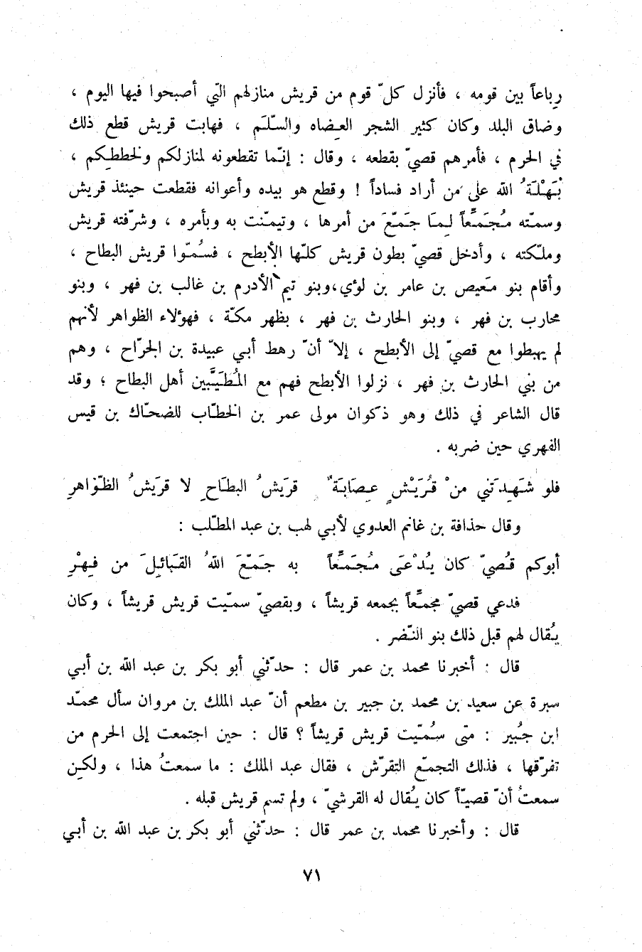 رِبَاعًا بَيْنَ قَوْمِهِ، فَأَنْزَلَ كُلَّ قَوْمٍ مِنْ قُرَيْشٍ مَنَازِلَهُمُ الَّتِي أَصْبَحُوا فِيهَا الْيَوْمَ وَضَاقَ الْبَلَدُ، وَكَانَ كَثِيرُ الشَّجَرِ الْعِضَاهِ وَالسَّلَمِ، فَهَابَتْ قُرَيْشٌ قَطْعَ ذَلِكَ فِي الْحَرَمِ، فَأَمَرَهُمْ قُصَيٌّ بِقَطْعِهِ، وَقَالَ: إِنَّمَا تَقْطَعُونَهُ لِمَنَازِلِكُمْ وَلِخُطَطِكُمْ، بَهْلَةُ اللَّهِ عَلَى مَنْ أَرَادَ فَسَادًا، وَقَطَعَ هُوَ بِيَدِهِ وَأَعْوَانُهُ، فَقَطَعَتْ حِينَئِذٍ قُرَيْشٌ وَسَمَّتْهُ مُجَمِّعًا لِمَا جَمَعَ مِنْ أَمْرِهَا، وَتَيَمَّنَتْ بِهِ وَبِأَمْرِهِ، وَشَرَّفَتْهُ قُرَيْشٌ وَمَلَّكَتْهُ، وَأَدْخَلَ قُصَيٌّ بُطُونَ قُرَيْشٍ كُلَّهَا الْأَبْطَحَ فَسُمُّوا قُرَيْشَ الْبِطَاحِ، وَأَقَامَ بَنُو مَعِيصِ بْنِ عَامِرِ بْنِ لُؤَيٍّ، وَبَنُو تَيْمٍ الْأَدْرَمِ بْنِ غَالِبِ بْنِ فِهْرٍ، وَبَنُو مُحَارِبِ بْنِ فِهْرٍ، وَبَنُو الْحَارِثِ بْنِ فِهْرٍ بِظَهْرِ مَكَّةَ، فَهَؤُلَاءِ الظَّوَاهِرُ؛ لِأَنَّهُمْ لَمْ يَهْبِطُوا مَعَ قُصَيٍّ إِلَى الْأَبْطَحِ إِلَّا أَنَّ رَهْطَ أَبِي عُبَيْدَةَ بْنِ الْجَرَّاحِ وَهُمْ مِنْ بَنِي الْحَارِثِ بْنِ فِهْرٍ نَزَلُوا الْأَبْطَحَ فَهُمْ مَعَ الْمُطَيَّبِينَ أَهْلِ الْبِطَاحِ وَقَدْ قَالَ الشَّاعِرُ فِي ذَلِكَ وَهُوَ ذَكْوَانُ مَوْلَى عُمَرَ بْنِ الْخَطَّابِ لِلضَّحَّاكِ بْنِ قَيْسٍ الْفِهْرِيِّ حِينَ ضَرَبَهُ: