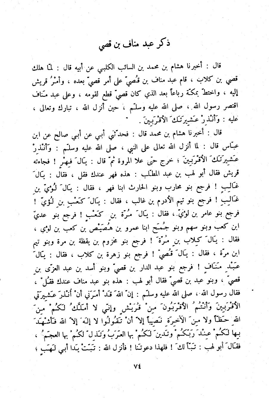 قَالَ: أَخْبَرَنَا هِشَامُ بْنُ مُحَمَّدِ بْنِ السَّائِبِ الْكَلْبِيُّ، عَنْ أَبِيهِ قَالَ: §لَمَّا هَلَكَ قُصَيُّ بْنُ كِلَابٍ قَامَ عَبْدُ مَنَافِ بْنُ قُصَيٍّ عَلَى أَمْرِ قُصَيٍّ بَعْدَهُ وَأَمْرِ قُرَيْشٍ إِلَيْهِ وَاخْتَطَ بِمَكَّةَ رُبَاعًا بَعْدَ الَّذِي كَانَ قُصَيٌّ قَطَعَ لِقَوْمِهِ وَعَلَى عَبْدِ مَنَافٍ اقْتَصَرَ رَسُولُ اللَّهِ صلّى الله عليه وسلم حِينَ أَنْزَلَ اللَّهُ تَبَارَكَ وَتَعَالَى عَلَيْهِ {وَأَنْذِرْ عَشِيرَتَكَ الْأَقْرَبِينَ} [الشعراء: 214]