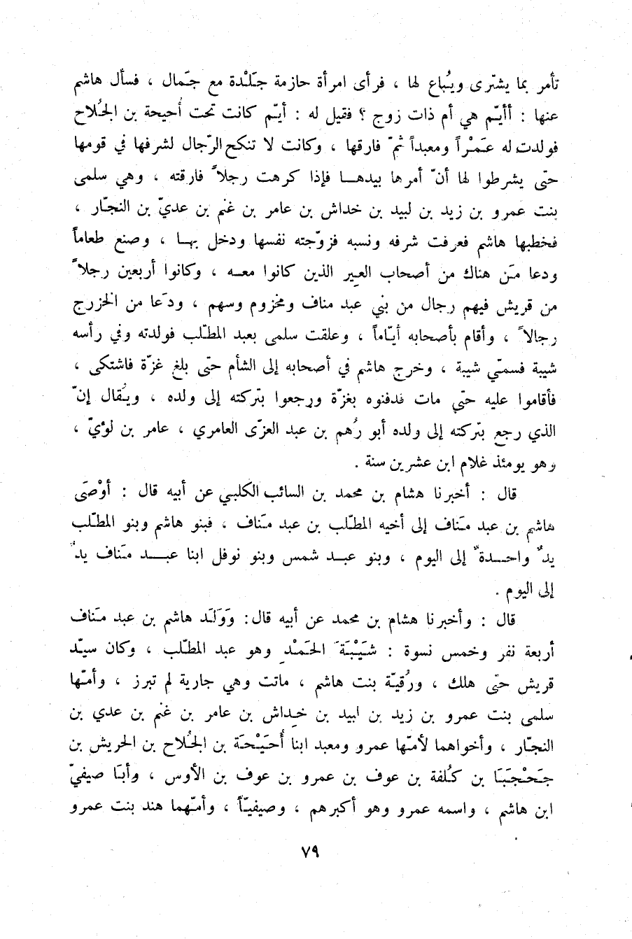 تَأْمُرُ بِمَا يُشْتَرَى وَيُبَاعُ لَهَا فَرَأَى امْرَأَةً حَازِمَةً جَلْدَةً مَعَ جَمَالٍ فَسَأَلَ هَاشِمٌ عَنْهَا أَأَيِّمٌ هِيَ أَمْ ذَاتُ زَوْجٍ؟ فَقِيلَ لَهُ: أَيِّمٌ هِيَ أَمْ ذَاتُ زَوْجٍ؟ فَقِيلَ لَهُ: أَيِّمٌ كَانَتْ تَحْتَ أُحَيْحَةَ بْنِ الْجُلَاحِ فَوَلَدَتْ لَهُ عَمْرًا وَمَعْبَدًا ثُمَّ فَارَقَهَا وَكَانَتْ لَا تَنْكِحُ الرِّجَالَ لِشَرَفِهَا فِي قَوْمِهَا حَتَّى يَشْرِطُوا لَهَا أَنَّ أَمْرَهَا بِيَدِهَا، فَإِذَا كَرِهَتْ رَجُلًا فَارَقَتْهُ وَهِيَ سَلْمَى بِنْتُ عَمْرِو بْنِ زَيْدِ بْنِ لَبِيدِ بْنِ خِدَاشِ بْنِ عَامِرِ بْنِ غَنْمِ بْنِ عَدِيِّ بْنِ النَّجَّارِ، فَخَطَبَهَا هَاشِمٌ، فَعَرَفَتْ شَرَفَهُ وَنَسَبَهُ فَزَوَّجَتْهُ نَفْسَهَا وَدَخَلَ بِهَا، وَصَنَعَ طَعَامًا وَدَعَا مَنْ هُنَاكَ مِنْ أَصْحَابِ الْعِيرِ الَّذِينَ كَانُوا مَعَهُ، وَكَانُوا أَرْبَعِينَ رَجُلًا مِنْ قُرَيْشٍ فِيهِمْ رِجَالٌ مِنْ بَنِي عَبْدِ مَنَافٍ وَمَخْزُومٍ وَسَهْمٍ، وَدَعَا مِنَ الْخَزْرَجِ رِجَالًا، وَأَقَامَ بِأَصْحَابِهِ أَيَّامًا وَعَلِقَتْ سَلْمَى بِعَبْدِ الْمُطَّلِبِ فَوَلَدَتْهُ، وَفِي رَأْسِهِ شَيْبَةٌ، فَسُمِّيَ شَيْبَةَ، وَخَرَجَ هَاشِمٌ فِي أَصْحَابِهِ إِلَى الشَّأْمِ حَتَّى بَلَغَ غَزَّةَ فَاشْتَكَى فَأَقَامُوا عَلَيْهِ حَتَّى مَاتَ فَدَفَنُوهُ بِغَزَّةَ، وَرَجَعُوا بِتَرِكَتِهِ إِلَى وَلَدِهِ، وَيُقَالُ: إِنَّ الَّذِيَ رَجَعَ بِتَرِكَتِهِ إِلَى وَلَدِهِ أَبُو رُهْمِ بْنُ عَبْدِ الْعُزَّى الْعَامِرِيُّ عَامِرُ بْنُ لُؤَيٍّ وَهُوَ يَوْمَئِذٍ غُلَامٌ ابْنُ عِشْرِينَ سَنَةً