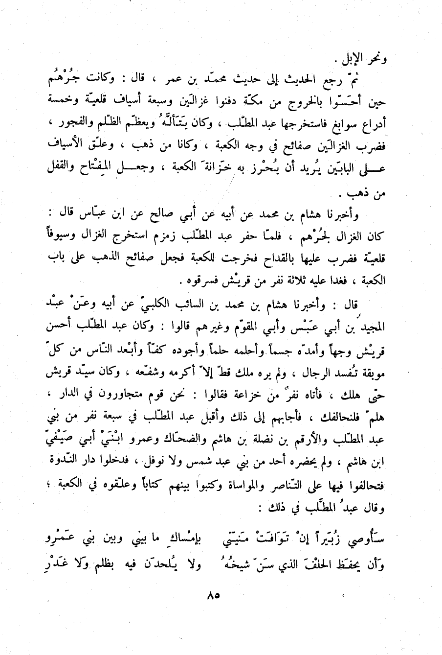وَنَحَرَ الْإِبِلَ ثُمَّ رَجَعَ الْحَدِيثُ إِلَى حَدِيثِ مُحَمَّدِ بْنِ عُمَرَ قَالَ: وَكَانَتْ جُرْهُمُ حِينَ أَحَسُّوا بِالْخُرُوجِ مِنْ مَكَّةَ دَفَنُوا غَزَالَيْنِ وَسَبْعَةَ أَسْيَافٍ قَلْعِيَّةٍ وَخَمْسَةَ أَدْرَاعٍ سَوَابِغَ فَاسْتَخْرَجَهَا عَبْدُ الْمُطَّلِبِ، وَكَانَ يَتَأَلَّهُ وَيُعَظِّمُ الظُّلْمَ وَالْفُجُورَ فَضَرَبَ الْغَزَالَيْنِ صَفَائِحَ فِي وَجْهِ الْكَعْبَةِ، وَكَانَا مِنْ ذَهَبٍ، وَعَلَّقَ الْأَسْيَافَ عَلَى الْبَابَيْنِ يُرِيدُ أَنْ يُحْرِزَ بِهِ خِزَانَةَ الْكَعْبَةِ وَجَعَلَ الْمِفْتَاحَ وَالْقُفْلَ مِنْ ذَهَبٍ