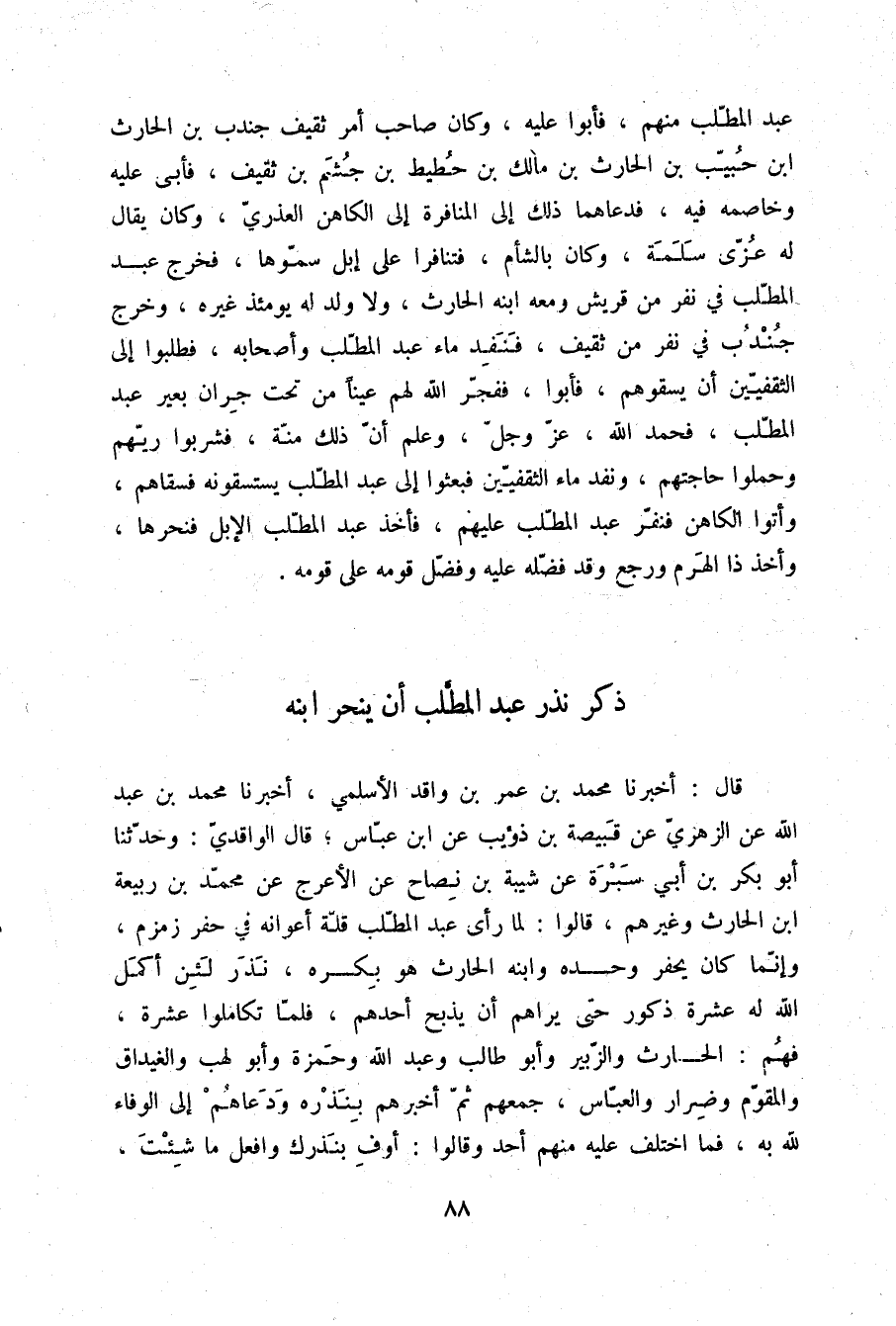 قَالَ: أَخْبَرَنَا مُحَمَّدُ بْنُ عُمَرَ بْنِ وَاقِدٍ الْأَسْلَمِيُّ، أَخْبَرَنَا مُحَمَّدُ بْنُ عَبْدِ اللَّهِ، عَنِ الزُّهْرِيِّ، عَنْ قَبِيصَةَ بْنِ ذُؤَيْبٍ، عَنِ ابْنِ عَبَّاسٍ قَالَ الْوَاقِدِيُّ: وَحَدَّثَنَا أَبُو بَكْرِ بْنُ أَبِي سَبْرَةَ، عَنْ شَيْبَةَ بْنِ نِصَاحٍ، عَنِ الْأَعْرَجِ، عَنْ مُحَمَّدِ بْنِ رَبِيعَةَ بْنِ الْحَارِثِ، وَغَيْرِهِمْ، قَالُوا: §لَمَّا رَأَى عَبْدُ الْمُطَّلِبِ قِلَّةَ أَعْوَانِهِ فِي حَفْرِ زَمْزَمَ وَإِنَّمَا كَانَ يَحْفِرُ وَحْدَهُ، وَابْنُهُ الْحَارِثُ هُوَ بِكْرُهُ نَذَرَ لَئِنْ أَكْمَلَ اللَّهُ لَهُ عَشَرَةَ ذُكُورٍ حَتَّى يَرَاهُمْ أَنْ يَذْبَحَ أَحَدَهُمْ فَلَمَّا تَكَامَلُوا عَشَرَةً، فَهُمُ الْحَارِثُ وَالزُّبَيْرُ وَأَبُو طَالِبٍ وَعَبْدُ اللَّهِ وَحَمْزَةُ وَأَبُو لَهَبٍ وَالْغَيْدَاقُ وَالْمُقَوَّمُ وَضِرَارٌ وَالْعَبَّاسُ، جَمَعَهُمْ ثُمَّ أَخْبَرَهُمْ بِنَذْرِهِ وَدَعَاهُمْ إِلَى الْوَفَاءِ لِلَّهِ بِهِ فَمَا اخْتَلَفَ عَلَيْهِ مِنْهُمْ أَحَدٌ وَقَالُوا: أَوْفِ بِنَذْرِكَ وَافْعَلْ مَا شِئْتَ -[89]- فَقَالَ: لِيَكْتُبْ كُلُّ رَجُلٍ مِنْكُمُ اسْمَهُ فِي قِدْحِهِ فَفَعَلُوا فَدَخَلَ عَبْدُ الْمُطَّلِبِ فِي جَوْفِ الْكَعْبَةِ وَقَال لِلسَّادِنِ: اضْرِبْ بِقِدَاحِهِمْ فَضَرَبَ فَخَرَجَ قَدَحُ عَبْدِ اللَّهِ أَوَّلُهَا وَكَانَ عَبْدُ الْمُطَّلِبِ يُحِبُّهُ فَأَخَذَ بِيَدِهِ يَقُودُهُ إِلَى الْمَذْبَحِ وَمَعَهُ الْمُدْيَةُ فَبَكَى بَنَاتُ عَبْدِ الْمُطَّلِبِ وَكُنَّ قِيَامًا، وَقَالَتْ إِحْدَاهُنَّ لِأَبِيهَا: أَعْذِرْ فِيهِ بِأَنْ تَضْرِبَ فِي إِبِلِكَ السَّوَائِمِ الَّتِي فِي الْحَرَمِ فَقَالَ لِلسَّادِنِ: اضْرِبْ عَلَيْهِ بِالْقِدَاحِ وَعَلَى عَشْرٍ مِنَ الْإِبِلِ وَكَانَتِ الدِّيَةُ يَوْمَئِذٍ عَشْرًا مِنَ الْإِبِلِ فَضَرَبَ فَخَرَجَ الْقَدَحُ عَلَى عَبْدِ اللَّهِ فَجَعَلَ يَزِيدُ عَشْرًا عَشْرًا، كُلُّ ذَلِكَ يَخْرُجُ الْقَدَحُ عَلَى عَبْدِ اللَّهِ حَتَّى كَمَلَتِ الْمِائَةُ، فَضَرَبَ بِالْقِدَاحِ فَخَرَجَ عَلَى الْإِبِلِ فَكَبَّرَ عَبْدُ الْمُطَّلِبِ وَالنَّاسُ مَعَهُ، وَاحْتَمَلَ بَنَاتُ عَبْدِ الْمُطَّلِبِ أَخَاهُنَّ عَبْدَ اللَّهِ وَقَدَّمَ عَبْدُ الْمُطَّلِبِ الْإِبِلَ فَنَحَرَهَا بَيْنَ الصَّفَا وَالْمَرْوَةِ