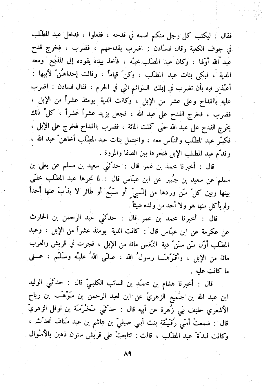 قَالَ: أَخْبَرَنَا مُحَمَّدُ بْنُ عُمَرَ قَالَ: حَدَّثَنِي سَعِيدُ بْنُ مُسْلِمٍ، عَنْ يَعْلَى بْنِ مُسْلِمٍ، عَنْ سَعِيدِ بْنِ جُبَيْرٍ، عَنِ ابْنِ عَبَّاسٍ قَالَ: §لَمَّا نَحَرَهَا عَبْدُ الْمُطَّلِبِ خَلَّى بَيْنَهَا وَبَيْنَ كُلِّ مَنْ وَرَدَهَا مِنْ إِنَسِيٍّ أَوْ سَبُعٍ أَوْ طَائِرٍ لَا يَذُبُّ عَنْهَا أَحَدًا وَلَمْ يَأْكُلْ مِنْهَا هُوَ وَلَا أَحَدٌ مِنْ وَلَدِهِ شَيْئًا