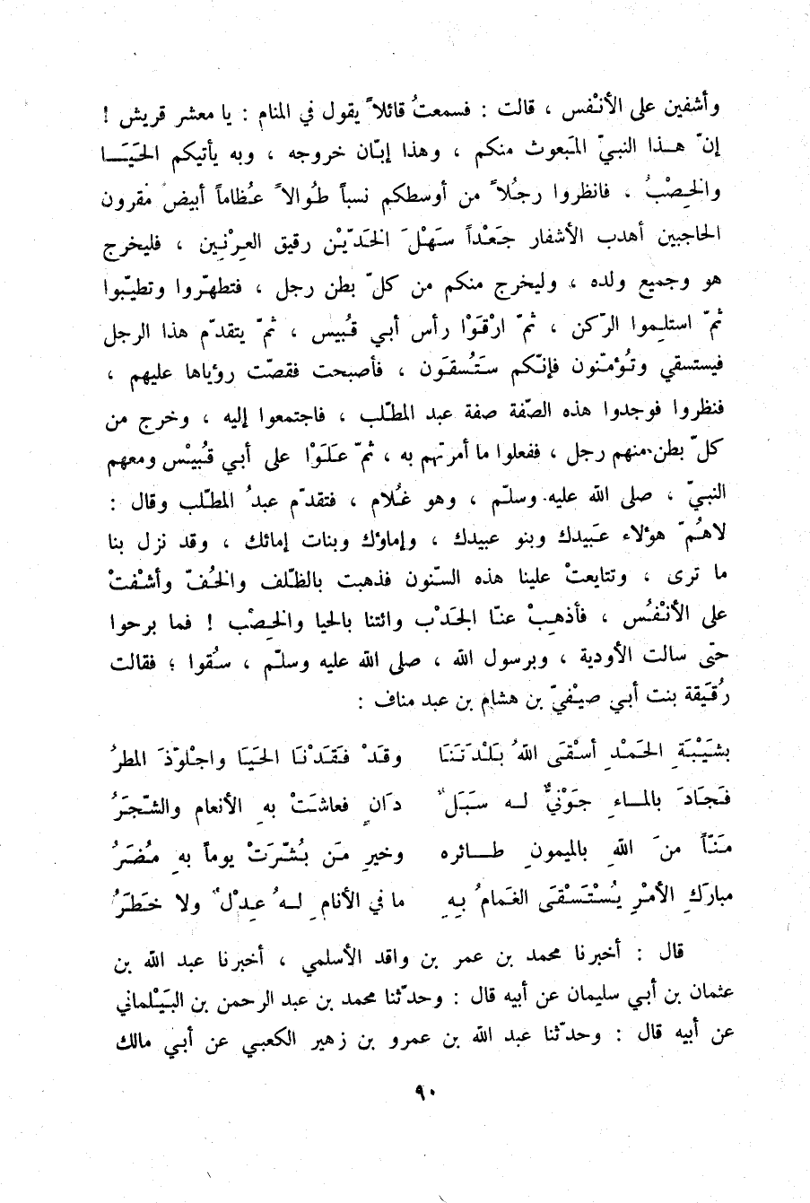 وَأَشْفَيْنَ عَلَى الْأَنْفُسِ، قَالَتْ: فَسَمِعْتُ قَائِلًا يَقُولُ فِي الْمَنَامِ: يَا مَعْشَرَ قُرَيْشٍ إِنَّ هَذَا النَّبِيَّ الْمَبْعُوثَ مِنْكُمْ، وَهَذَا إِبَّانُ خُرُوجِهِ وَبِهِ يَأْتِيكُمُ الْحَيَا وَالْخِصْبُ فَانْظُرُوا رَجُلًا مِنْ أَوْسَطِكُمْ نَسَبًا طُوَالًا عِظَامًا أَبْيَضَ مَقْرُونَ الْحَاجِبَيْنِ أَهْدَبَ الْأَشْفَارِ جَعْدًا سَهْلَ الْخَدَّيْنِ رَقِيقَ الْعِرْنِينِ فَلْيَخْرُجْ هُوَ وَجَمِيعُ وَلَدِهِ، وَلْيَخْرُجْ مِنْكُمْ مِنْ كُلِّ بَطْنٍ رَجُلٌ، فَتَطَهَّرُوا وَتَطَيَّبُوا ثُمَّ اسْتَلِمُوا الرُّكْنَ، ثُمَّ ارْقَوْا رَأْسَ أَبِي قُبَيْسٍ، ثُمَّ يَتَقَدَّمُ هَذَا الرَّجُلُ فَيَسْتَسْقِي وَتُؤَمِّنُونَ، فَإِنَّكُمْ سَتُسْقَوْنَ، فَأَصْبَحَتْ فَقَصَّتْ رُؤْيَاهَا عَلَيْهِمْ، فَنَظَرُوا فَوَجَدُوا هَذِهِ الصِّفَةَ صِفَةَ عَبْدِ الْمُطَّلِبِ، فَاجْتَمَعُوا إِلَيْهِ وَخَرَجَ مِنْ كُلِّ بَطْنٍ مِنْهُمْ رَجُلٌ، فَفَعَلُوا مَا أَمَرَتْهُمْ بِهِ، ثُمَّ عَلَوْا عَلَى أَبِي قُبَيْسٍ وَمَعَهُمُ النَّبِيُّ صلّى الله عليه وسلم وَهُوَ غُلَامٌ، فَتَقَدَّمَ عَبْدُ الْمُطَّلِبِ وَقَالَ: لَاهُمَّ هَؤُلَاءِ عَبِيدُكَ وَبَنُو عَبِيدِكَ، وَإِمَاؤُكَ وَبَنَاتُ إِمَائِكَ، وَقَدْ نَزَلَ بِنَا مَا تَرَى وَتَتَابَعَتْ عَلَيْنَا هَذِهِ السُّنُونَ، فَذَهَبَتْ بِالظُّلُفِ وَالْخُفِّ، وَأَشْفَتْ عَلَى الْأَنْفُسِ، فَأَذْهِبْ عَنَّا الْجَدْبَ، وَائْتِنَا بِالْحَيَا وَالْخِصْبِ، فَمَا بَرِحُوا حَتَّى سَاَلْتِ الْأَوْدِيَةُ، وَبِرَسُولِ اللَّهِ صلّى الله عليه وسلم سُقُوا، فَقَالَتْ رُقَيْقَةُ بِنْتُ أَبِي صَيْفِيِّ بْنِ هِشَامِ بْنِ عَبْدِ مَنَافٍ: