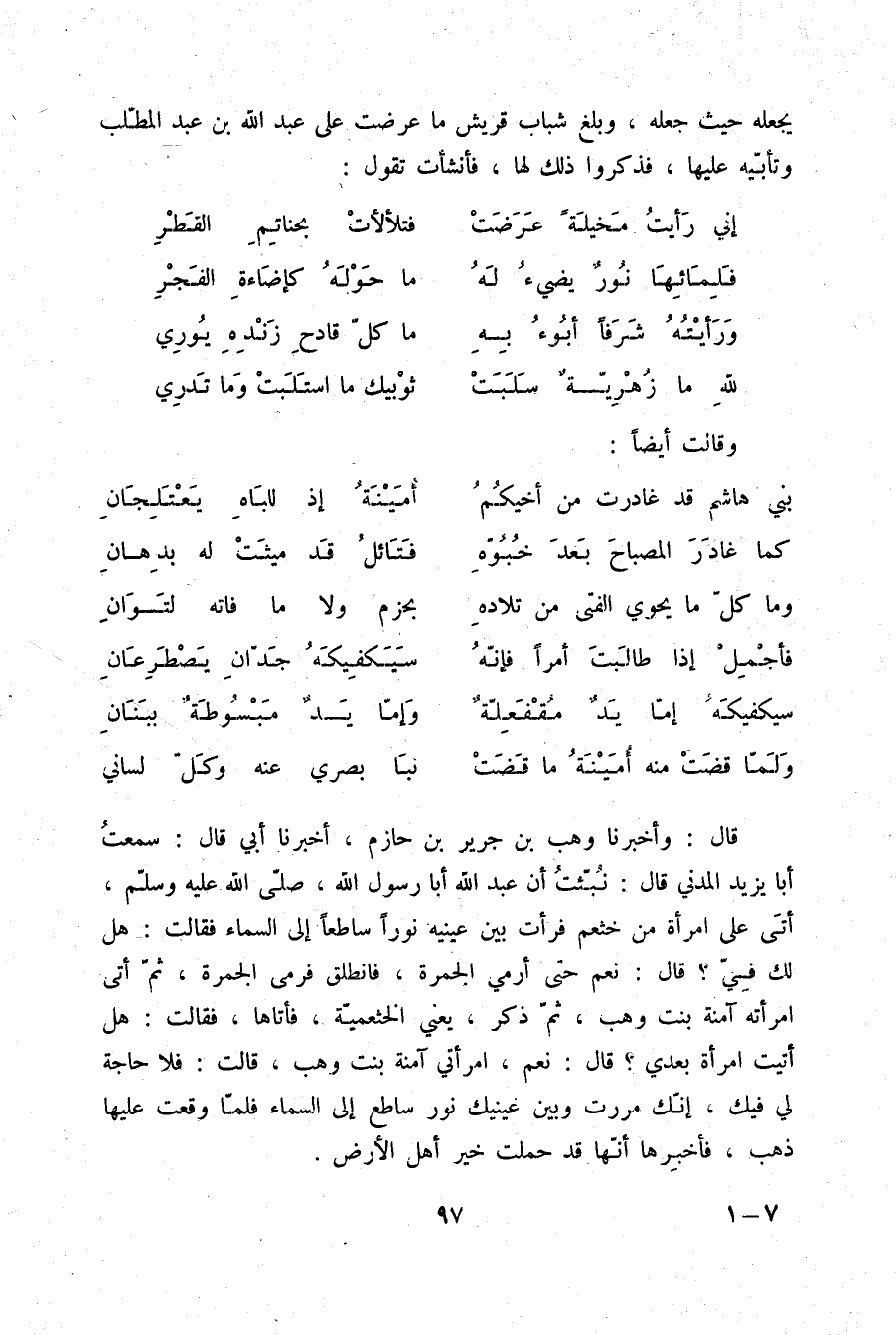 قَالَ: وَأَخْبَرَنَا وَهْبُ بْنُ جَرِيرِ بْنِ حَازِمٍ، أَخْبَرَنَا أَبِي قَالَ: سَمِعْتُ أَبَا يَزِيدَ الْمَدَنِيَّ قَالَ: نُبِّئْتُ " أَنَّ §عَبْدَ اللَّهِ أَبَا رَسُولِ اللَّهِ صلّى الله عليه وسلم أَتَى عَلَى امْرَأَةٍ مِنْ خَثْعَمٍ فَرَأَتْ بَيْنَ عَيْنَيْهِ نُورًا سَاطِعًا إِلَى السَّمَاءِ فَقَالَتْ: هَلْ لَكَ فِيَّ؟ قَالَ: نَعَمْ حَتَّى أَرْمِي الْجَمْرَةَ فَانْطَلَقَ فَرَمَى الْجَمْرَةَ ثُمَّ أَتَى امْرَأَتَهُ آمِنَةَ بِنْتَ وَهْبٍ ثُمَّ ذَكَرَ يَعْنِي الْخَثْعَمِيَّةَ فَأَتَاهَا فَقَالَتْ: هَلْ أَتَيْتَ امْرَأَةً بَعْدِي؟ قَالَ: نَعَمِ , امْرَأَتِي آمِنَةَ بِنْتَ وَهْبٍ قَالَتْ: فَلَا حَاجَةَ لِي فِيكَ إِنَّكَ مَرَرْتَ وَبَيْنَ عَيْنَيْكَ نُورٌ سَاطِعٌ إِلَى السَّمَاءِ فَلَمَّا وَقَعْتَ عَلَيْهَا ذَهَبَ فَأَخْبَرَهَا أَنَّهَا قَدْ حَمَلَتْ خَيْرَ أَهْلِ الْأَرْضِ