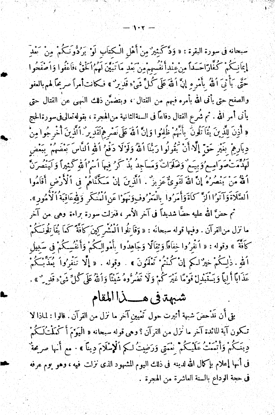 بقي أن ندحض شبهة أثيرت حول تعيين آخر ما نزل من القرآن. قالوا: لماذا لا تكون آية المائدة آخر ما نزل من القرآن؟ وهي قوله سبحانه: {الْيَوْمَ أَكْمَلْتُ لَكُمْ دِينَكُمْ وَأَتْمَمْتُ عَلَيْكُمْ نِعْمَتِي وَرَضِيتُ لَكُمُ الْأِسْلامَ دِيناً} . مع أنها صريحة في أنها إعلام بإكمال الله لدينه في ذلك اليوم المشهود الذي نزلت فيه وهو يوم عرفة في حجة الوداع بالسنة العاشرة من الهجرة.