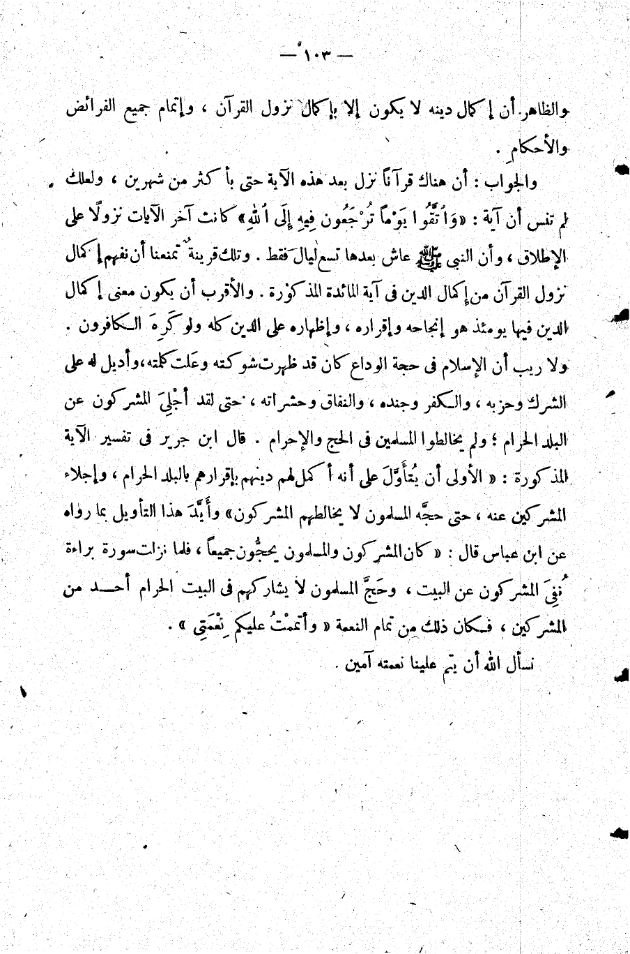والأقرب أن يكون معنى إكمال الدين فيها يومئذ هو إنجاحه وإقراره وإظهاره على الدين كله ولو كره الكافرون. ولا ريب أن الإسلام في حجة الوداع كان قد ظهرت شوكته وعلت كلمته وأديل له على الشرك وحزبه والكفر وجنده والنفاق وحسراته حتى لقد أجلي المشركون عن البلد الحرام ولم يخالطوا المسلمين في الحج والإحرام. قال ابن جرير في تفسير الآية المذكورة: الأولى أن يتأول على أنه أكمل لهم دينهم بإقرارهم بالبلد الحرام وإجلاء المشركين عنه حتى حجه المسلمون لا يخالطهم المشركون وأيد هذا التأويل بما رواه عن ابن عباس قال: كان المشركون والمسلمون يحجون جميعا فلما نزلت سورة براءة نفي المشركون عن البيت وحج المسلمون لا يشاركهم في البيت الحرام أحد من المشركين فكان ذلك من تمام النعمة {وَأَتْمَمْتُ عَلَيْكُمْ نِعْمَتِي} .