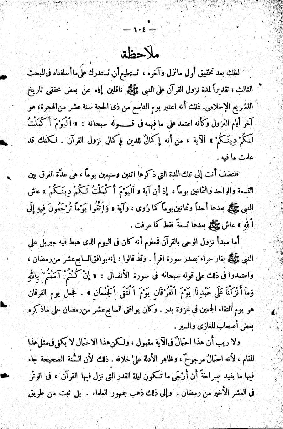 لعلك بعد تحقيق أول ما نزل وآخره تستطيع أن تستدرك على ما أسلفناه في المبحث الثالث تقديرا لمدة نزول القرآن على النبي صلى الله عليه وسلم ناقلين إياه عن بعض محققي تاريخ التشريع الإسلامي. ذلك أنه اعتبر يوم التاسع من ذي الحجة سنة عشر من الهجرة هو آخر أيام النزول وكأنه اعتمد على ما فهمه في قوله سبحانه: {الْيَوْمَ أَكْمَلْتُ لَكُمْ دِينَكُمْ} الآية من أنه إكمال للدين بإكمال نزول القرآن. لكنك قد علمت ما فيه.