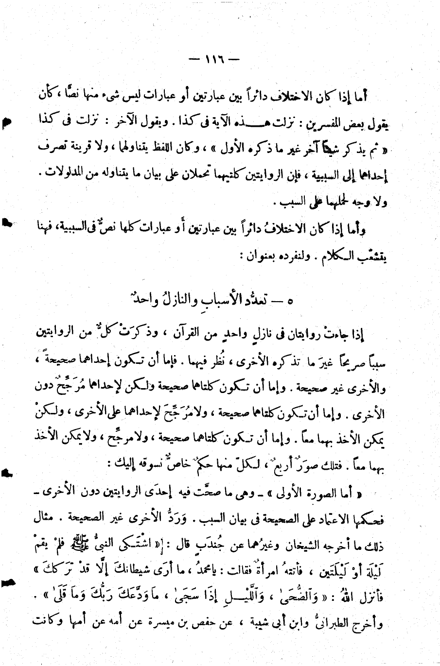 أما الصورة الأولى- وهي ما صحت فيه إحدى الروايتين دون الأخرى فحكمها الاعتماد على الصحيحة في بيان السبب. ورد الأخرى غير الصحيحة. مثال ذلك ما أخرجه الشيخان وغيرهما عن جندب قال: اشتكى النبي صلى الله عليه وسلم فلم يقم ليلة أو ليلتين فأتته امرأة فقالت: يا محمد ما أرى شيطانك إلا قد تركك فأنزل الله: {وَالضُّحَى وَاللَّيْلِ إِذَا سَجَى مَا وَدَّعَكَ رَبُّكَ وَمَا قَلَى} . وأخرج الطبراني وابن أبي شيبة عن حفص بن ميسرة عن أمه عن أمها وكانت